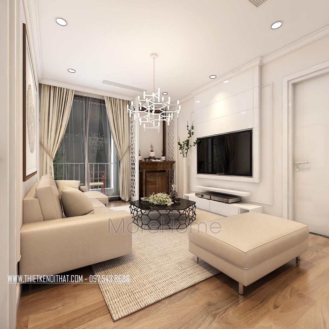 Bên cạnh đó, ánh sáng tự nhiên cũng là một yếu tố quan trọng giúp không gian trở nên mở và tràn đầy sức sống. Kính cường lực trong suốt được sử dụng để tạo độ mở và tăng cảm giác cơi nới cho không gian phòng hẹp. Một góc nhỏ của phòng khách được dành đặt bàn thờ trang nghiêm. Thiết kế vách gỗ hoa văn nhẹ nhàng được sử dụng tạo góc nhỏ riêng biệt vừa đảm bảo tính thẩm mỹ lại giúp tạo sự rõ ràng trong không gian. Thiết kế bàn thờ đơn giản, không quá cầu kỳ, có các họa tiết trạm khắc đơn giản, nhẹ nhàng giúp đảm bảo tính thẫm mỹ cho không gian, tone màu nâu trầm ấp áp giúp mang lại cảm giác an toàn, an nhiên cho gia chủ.