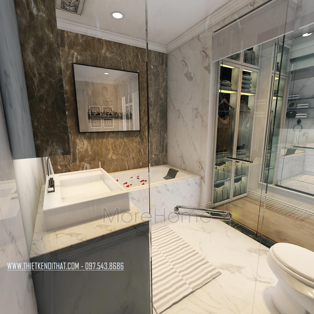 Cuối cùng là thiết kế nội thất phòng tắm hiện đại. Các vật liệu nhẹ như gương, kính cường lực trong suốt là các vật liệu được sử dụng nhiều nhất giúp tạo sự liền mạch và tăng độ mở cho không gian. Đá tự nhiên ốp tường hoa văn đơn giản, vừa đảm bảo tính thẩm mỹ lại dễ dàng lau chùi.