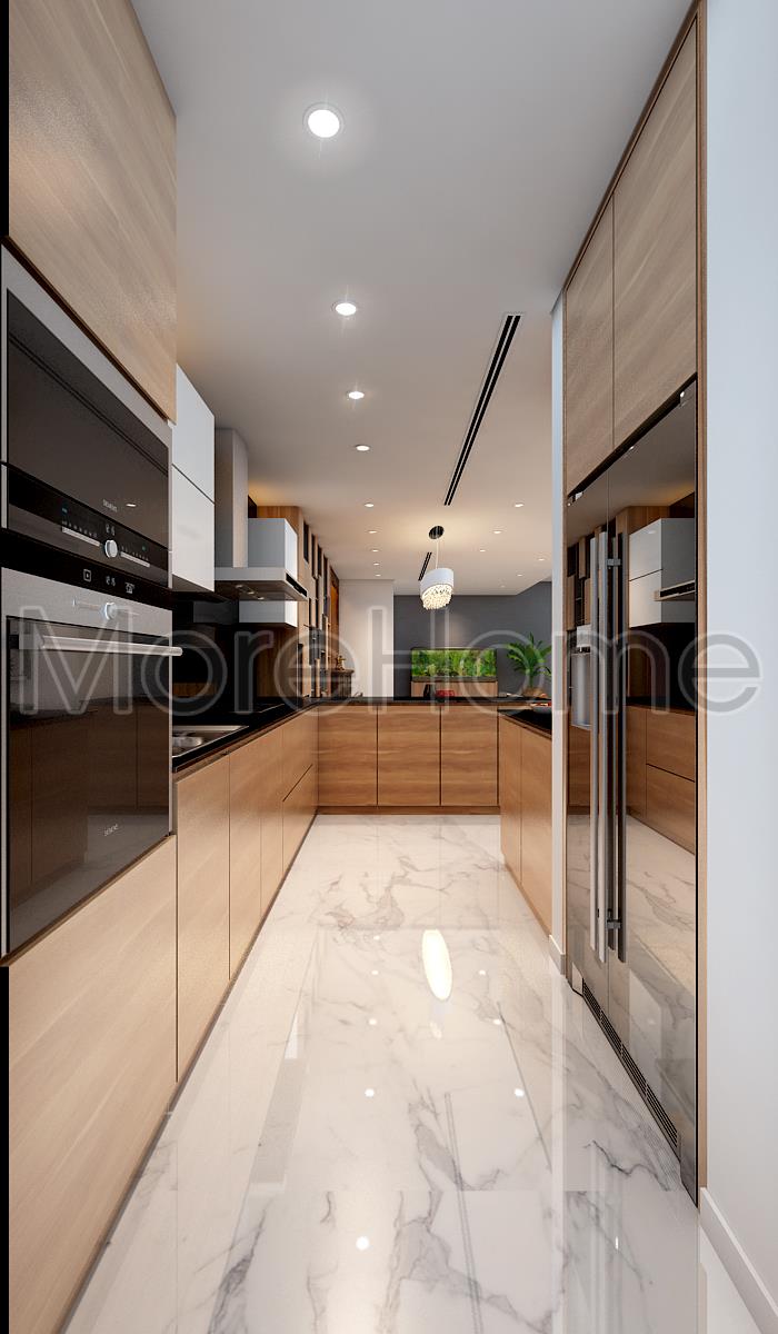 Hệ thống tủ bếp sử dụng gỗ tự nhiên làm vật liệu chính với các ngăn tiện dụng được sắp xếp hợp lý đảm bảo tính công năng và mang lại sự tiện nghi cho không gian sống.