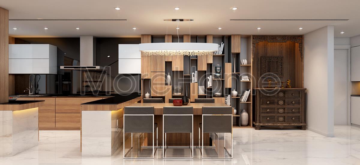Không gian bếp được thiết kế liền kề không tạo vách ngăn tường thô cứng mà chỉ giữ một kệ bếp nhẹ nhàng với chiều cao vừa phải vừa đảm bảo tính rõ ràng trong thiết kế lại không làm ảnh hưởng đến tầm quan sát của gia chủ.