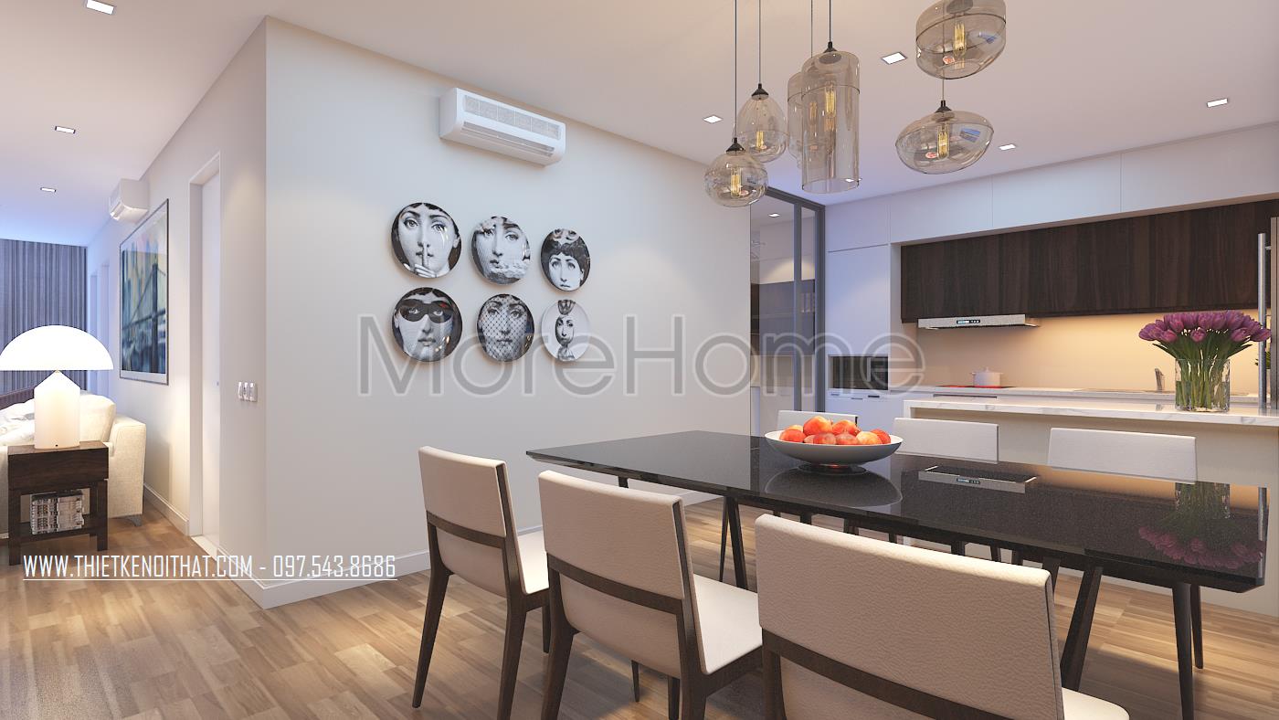 Thiết kế nội thất khu bàn ăn không quá đi sâu vào chi tiết mà quan tâm hơn đến tính công năng và sự tiện nghi cho gia đình. Bàn ăn nhỏ được đặt giữa bàn tạo sự linh hoạt cho các hoạt động của các thành viên trong gia đình. Thiết kế mặt bàn ăn sử dụng chất liệu kính cường lực dễ dàng trong việc lau chùi và vệ sinh. Để tránh sự đơn điệu trong thiết kế, kiến trúc sư đã khéo léo đặt một vài vật dụng trang trí với các tone màu lạ mắt mang lại ấn tượng và sự hài hòa trong thiết kế.