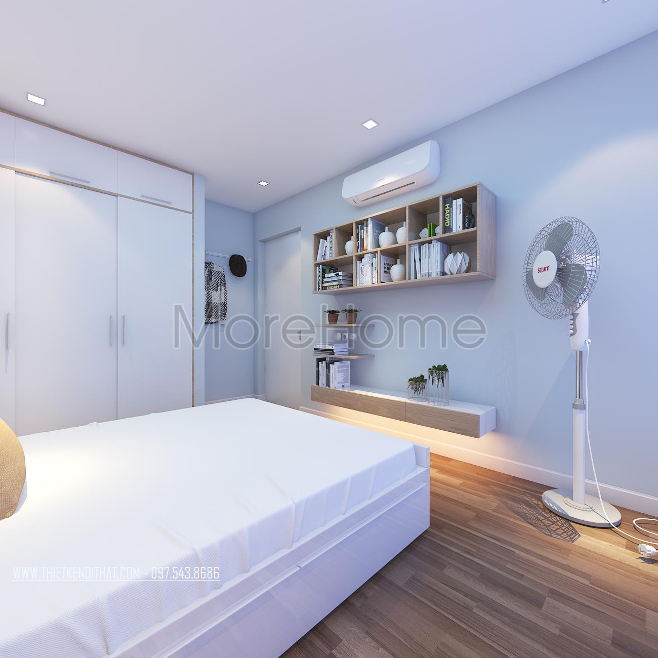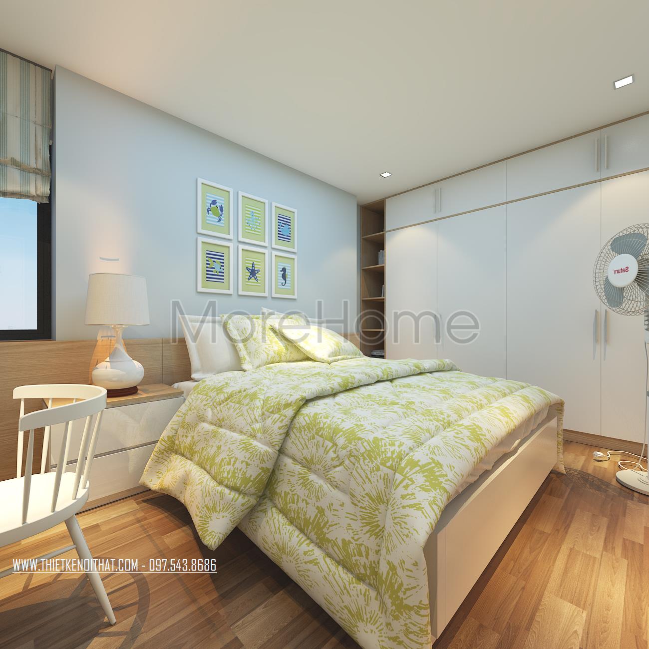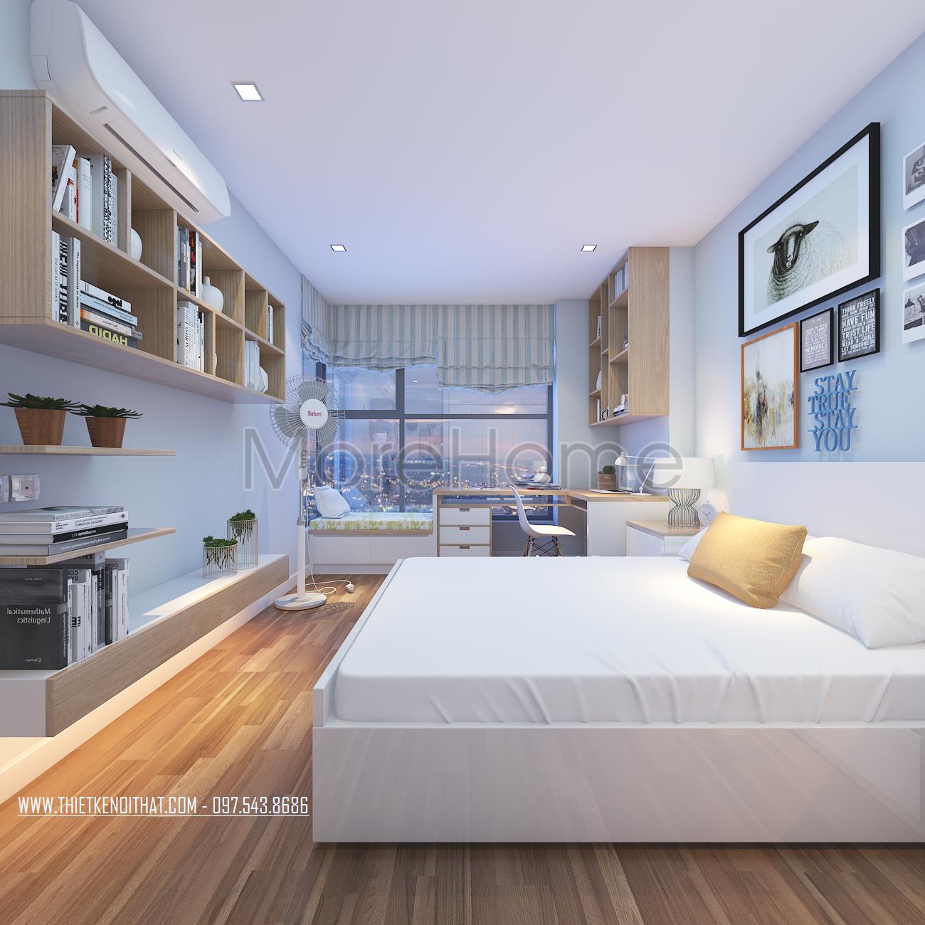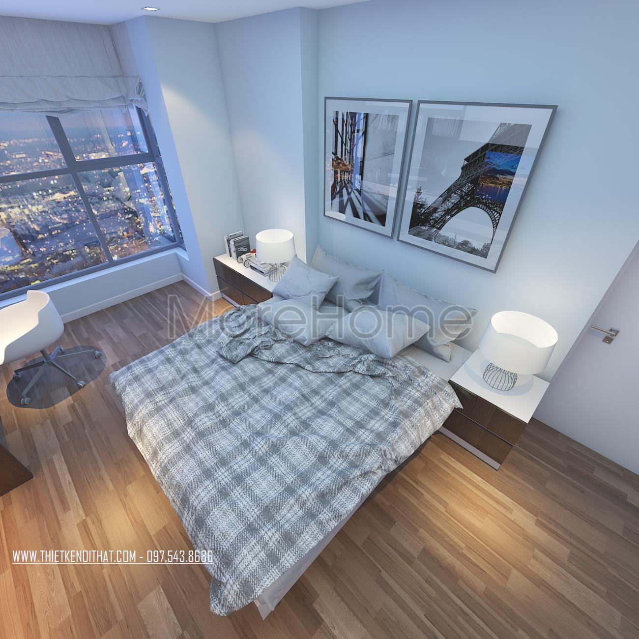 Cuối cùng là thiết kế nội thất không gian phòng ngủ sử dụng các tone màu vàng và xanh pastel làm điểm nhấn theo nét cá tính và sở thích của từng thành viên. Các vật liệu nhẹ như gỗ tự nhiên và kính cường lực được sử dụng để tránh cảm giác nặng nề và tăng độ thoáng cho không gian.