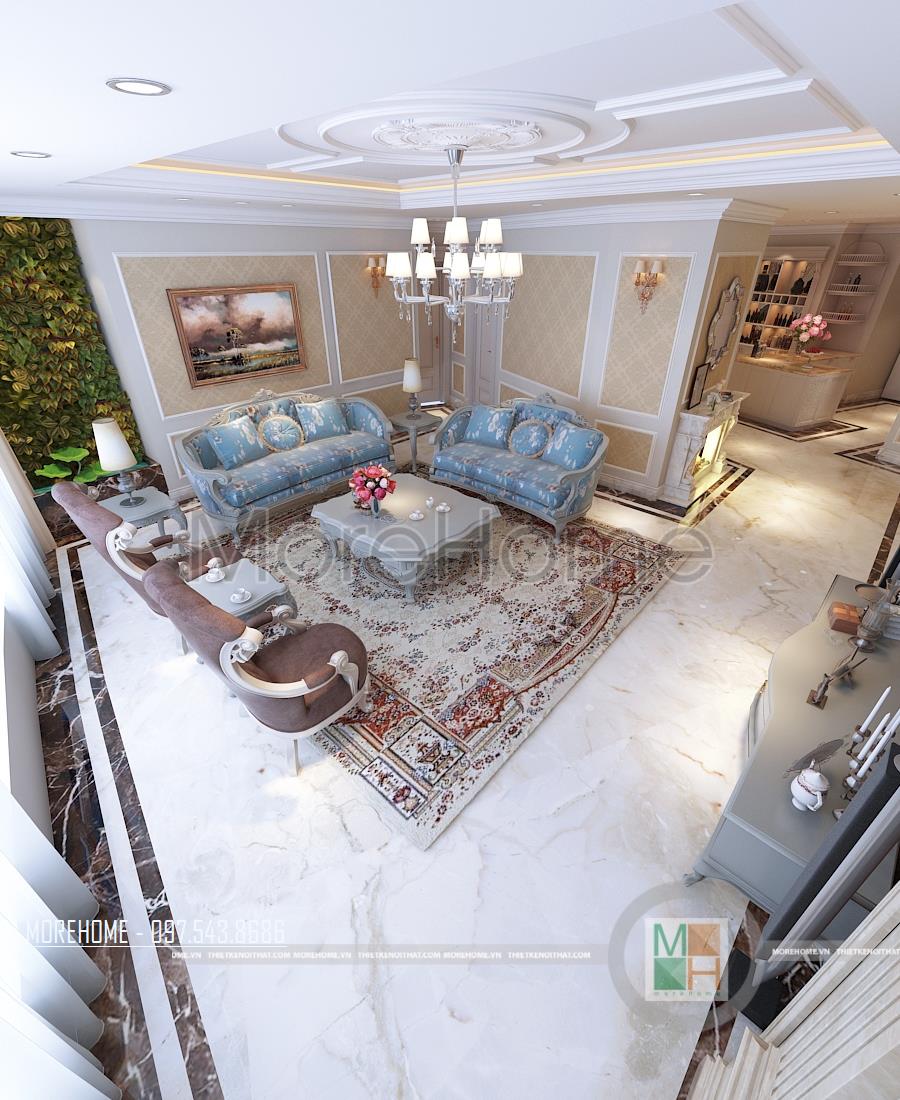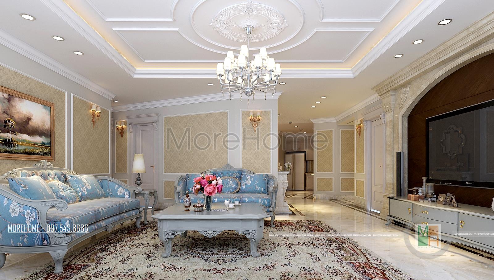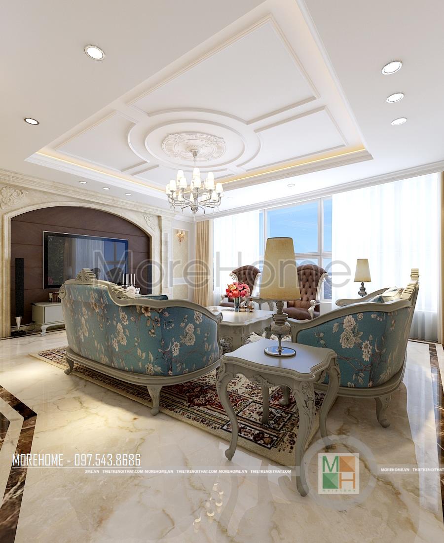 Thiết kế nội thất phong cách tân cổ điển sử dụng tone màu sáng giúp mang lại cho chúng ta cảm giác cơi nới về không gian và tạo độ thoáng cho căn phòng. Bộ sofa tone màu xanh ngọc với họa tiết hoa văn cổ điển mang đậm phong cách thiết kế cổ điển châu Âu. Các đường cong tinh tế và trạm khắc cổ điển trên bàn ghế đều là các chi tiết tạo điểm nhấn thẩm mỹ căn phòng.
