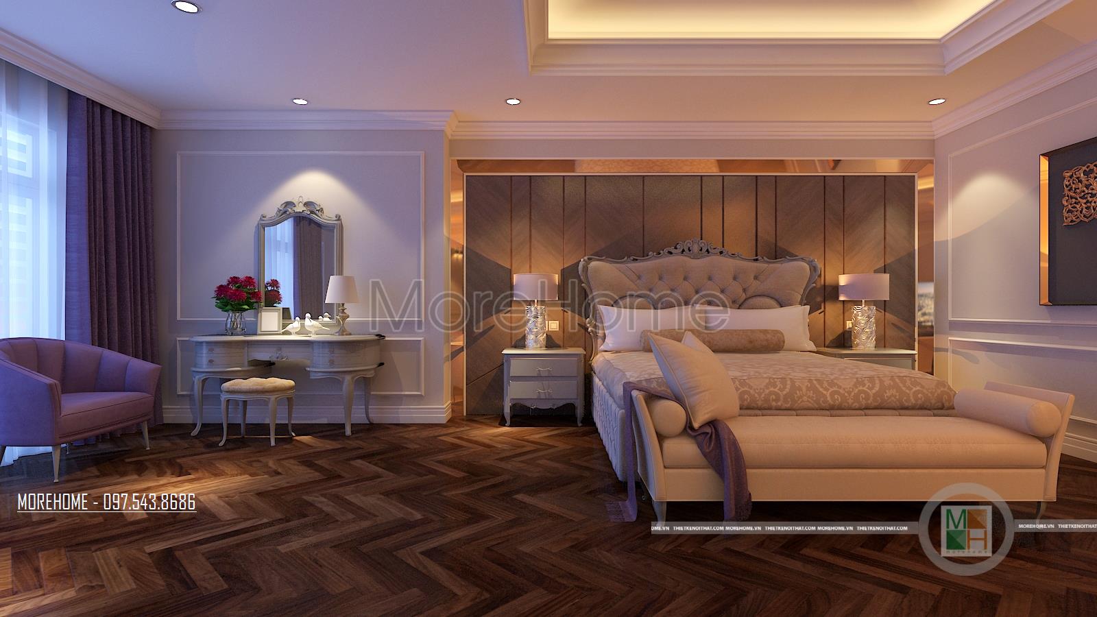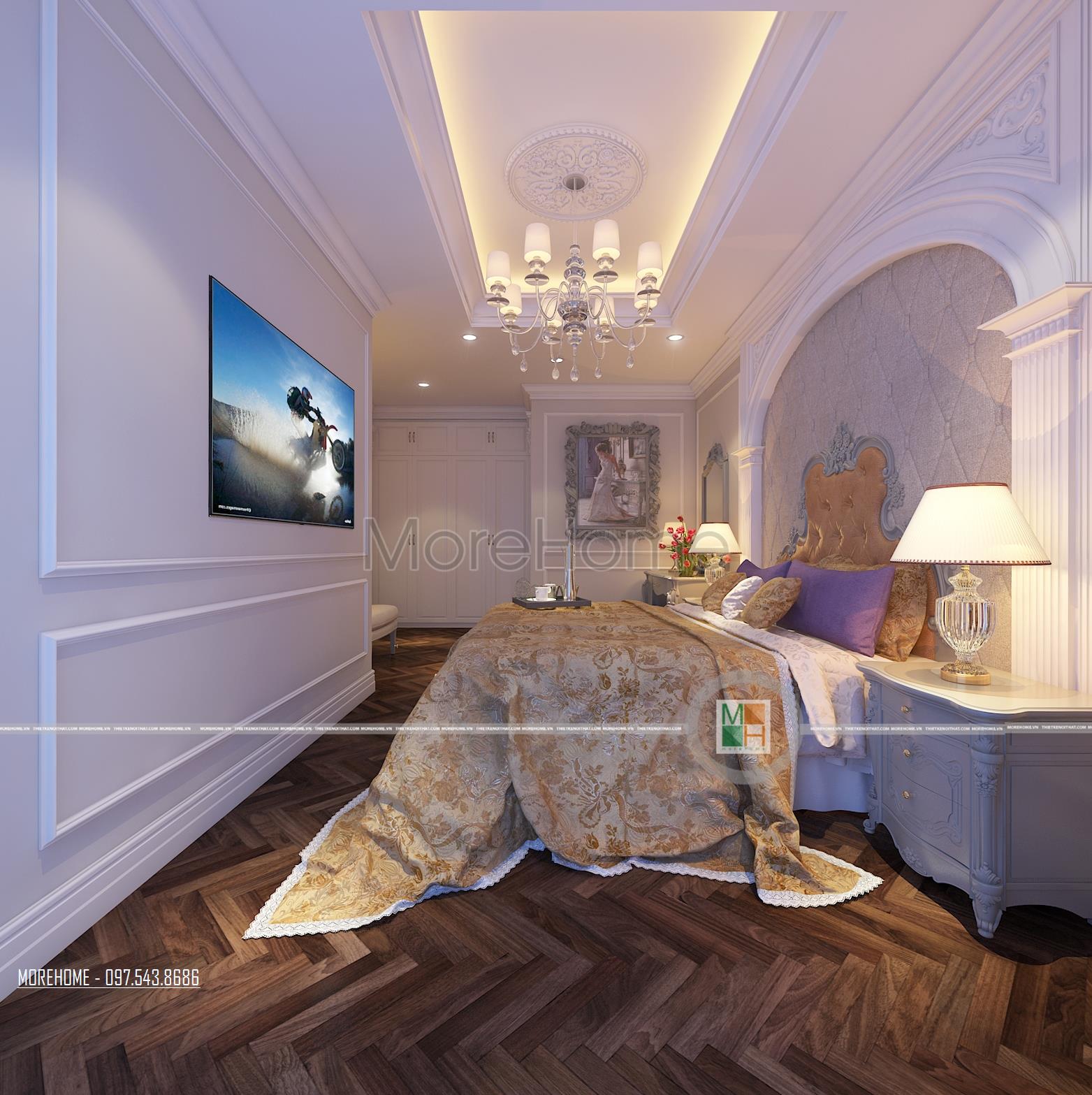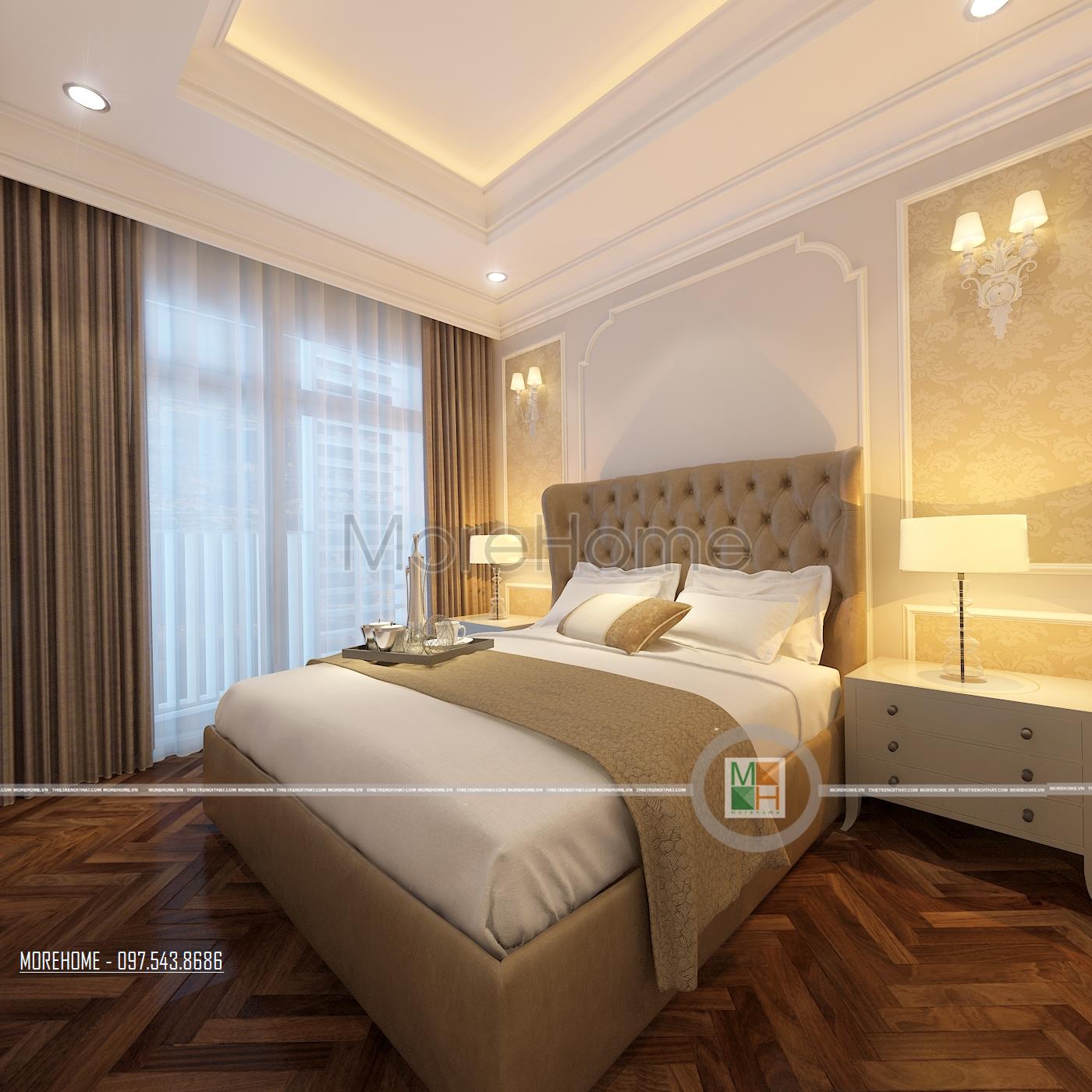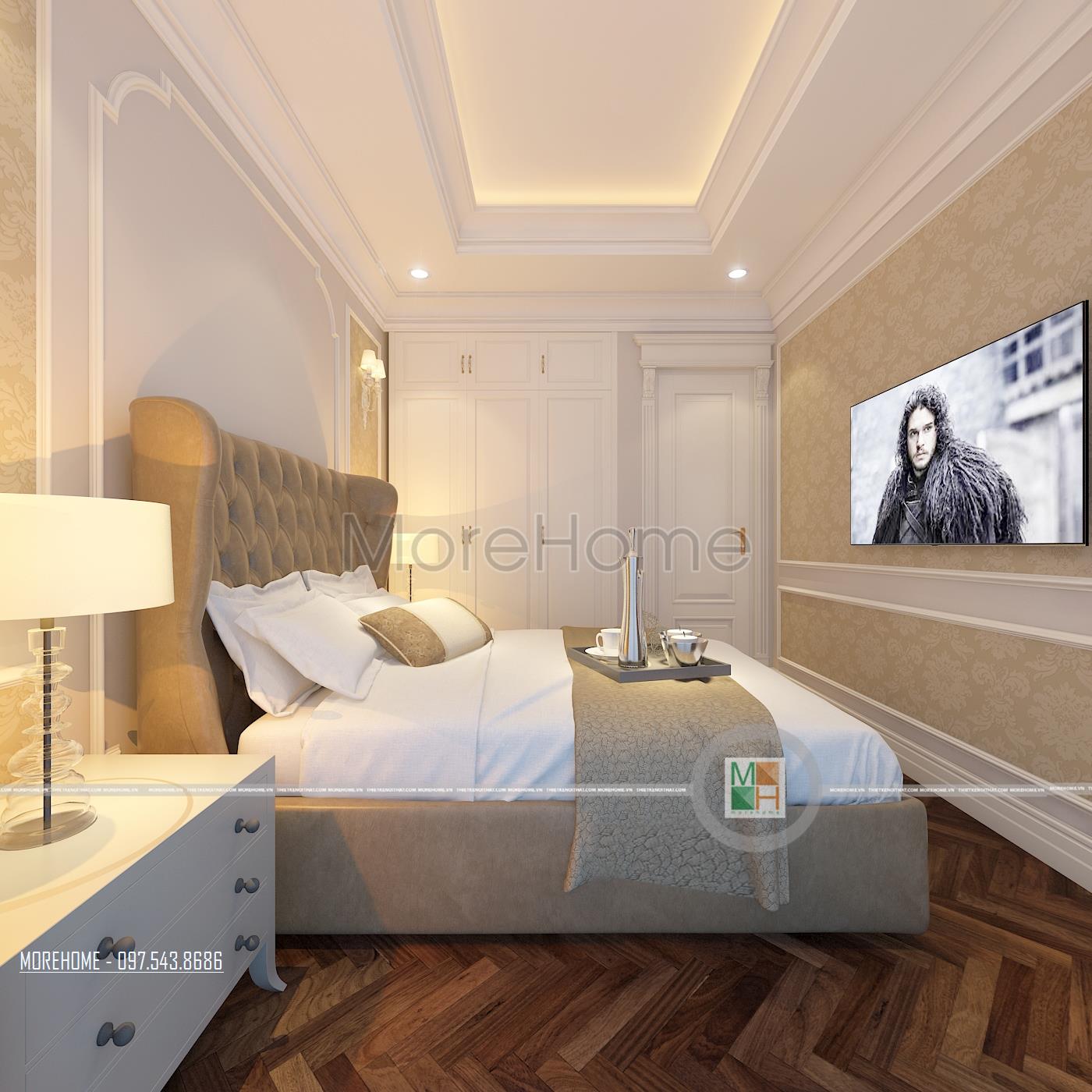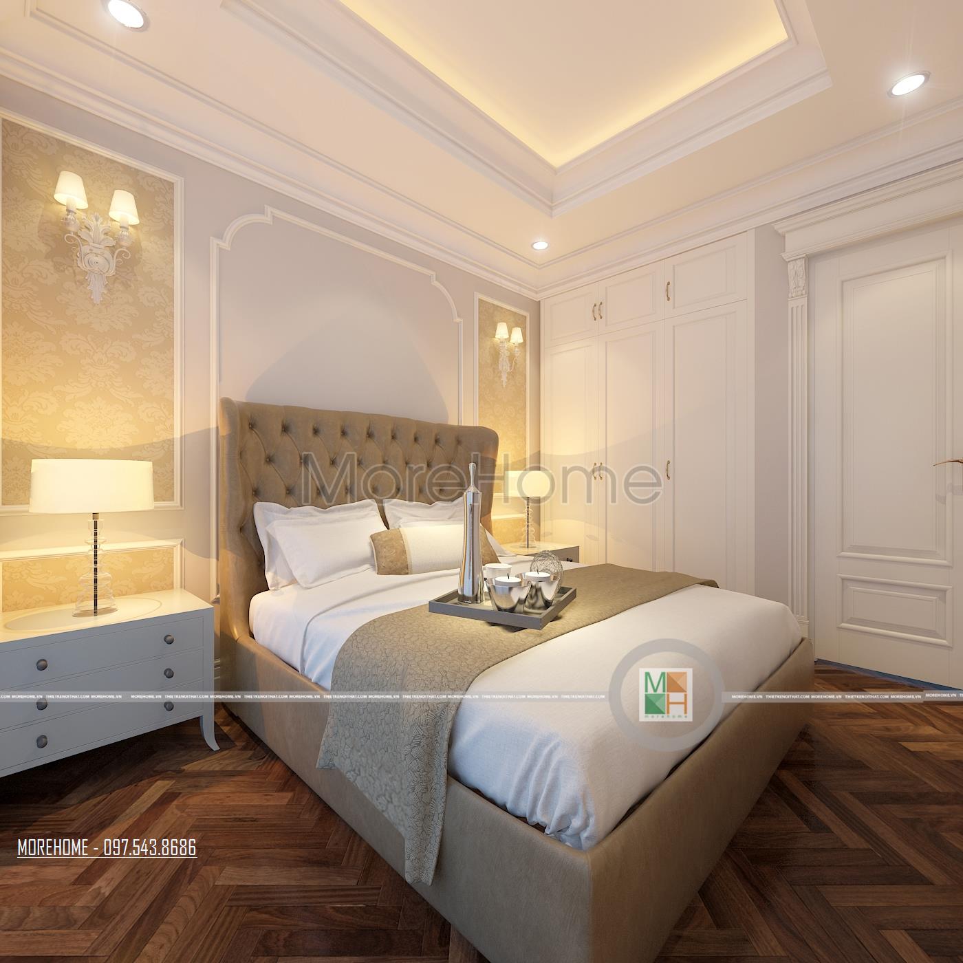 Tiếp đến là thiết kế nội thất phòng ngủ tân cổ điển. Tone màu vàng ánh kim và trắng sáng được ưu ái sử dụng mang đến sự thoải mái và dễ chịu cho gia chủ. Thiết kế dạng mái vòm điển hình theo phong cách châu Âu cổ mang lại sự nhẹ nhàng và tinh tế cho không gian. Ngoài ra, các thiết kế tủ gỗ âm tường được sắp xếp hợp lý vừa tiết kiệm không gian lại không làm mất đi tính công năng của sản phẩm.