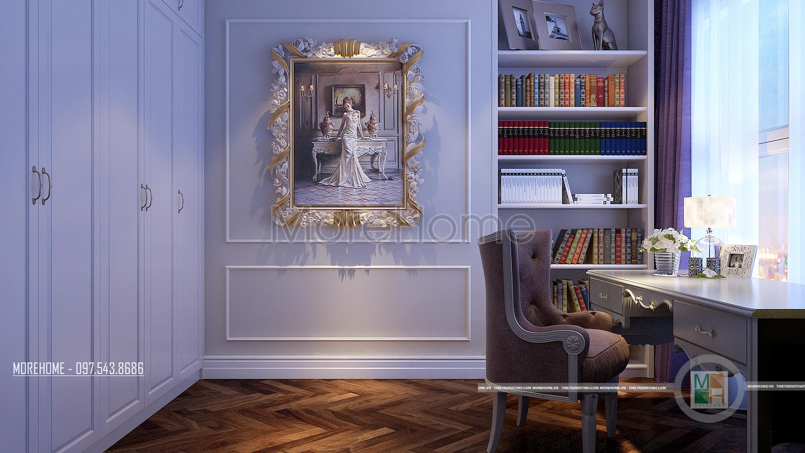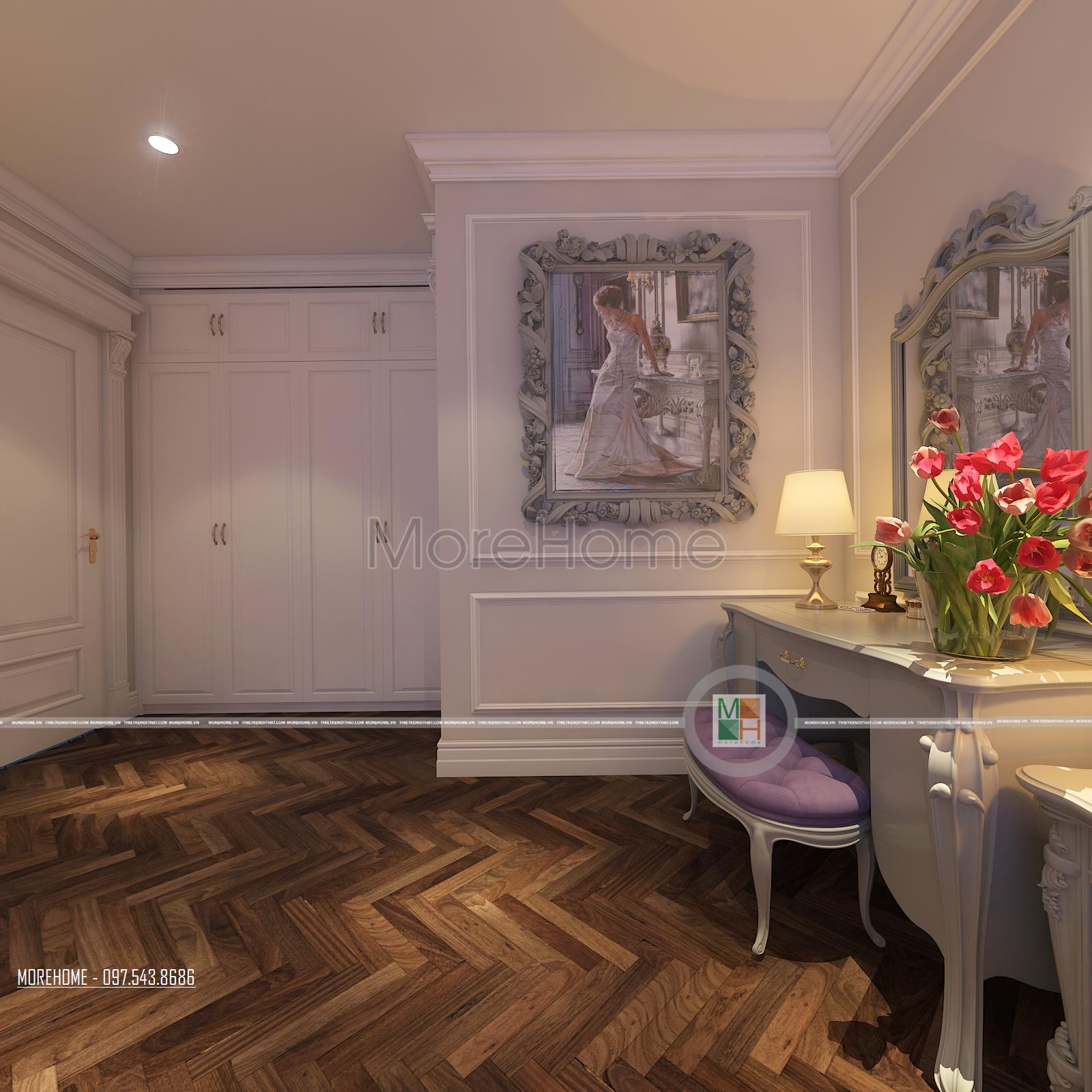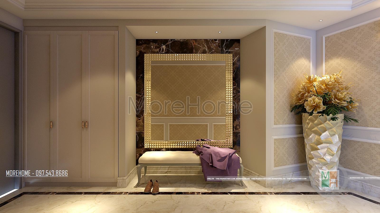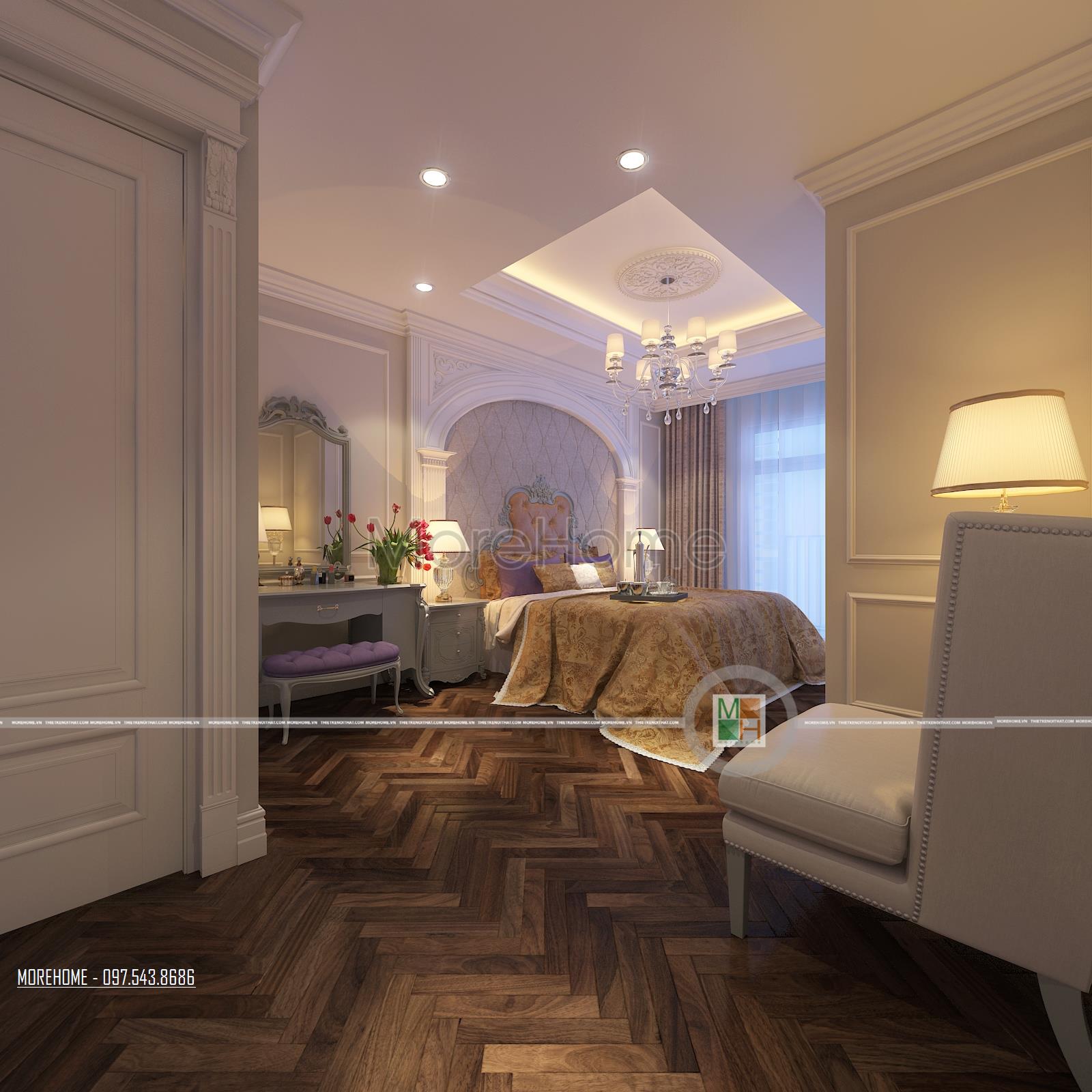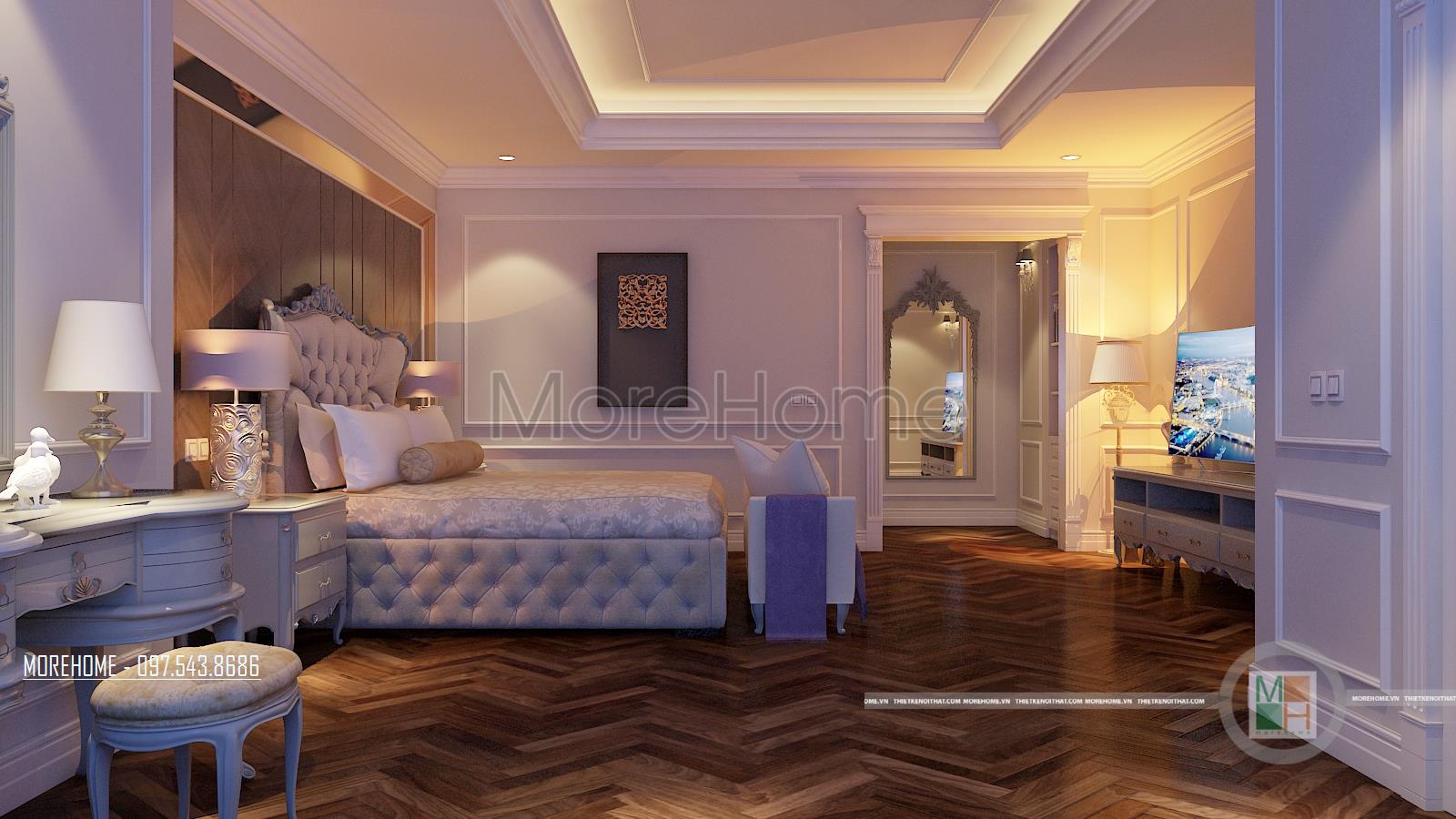 Tiếp đến là thiết kế nội thất phòng ngủ tân cổ điển. Tone màu vàng ánh kim và trắng sáng được ưu ái sử dụng mang đến sự thoải mái và dễ chịu cho gia chủ. Thiết kế dạng mái vòm điển hình theo phong cách châu Âu cổ mang lại sự nhẹ nhàng và tinh tế cho không gian. Ngoài ra, các thiết kế tủ gỗ âm tường được sắp xếp hợp lý vừa tiết kiệm không gian lại không làm mất đi tính công năng của sản phẩm.