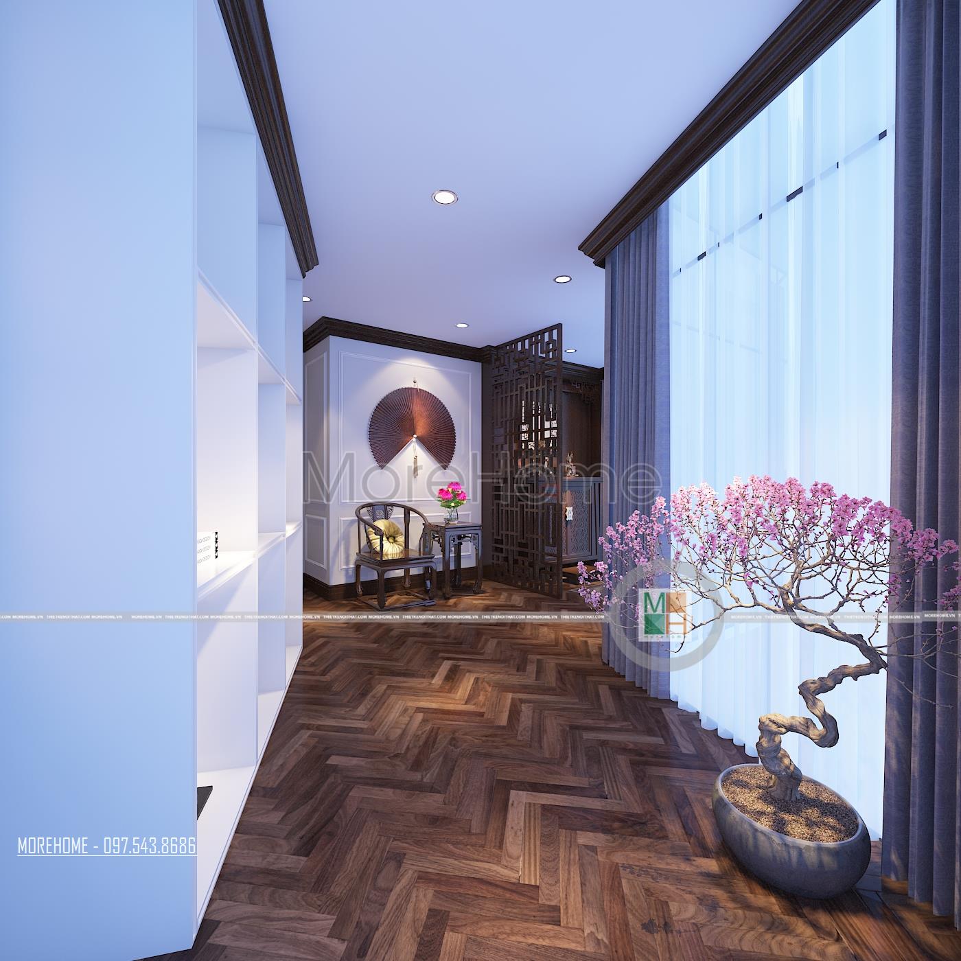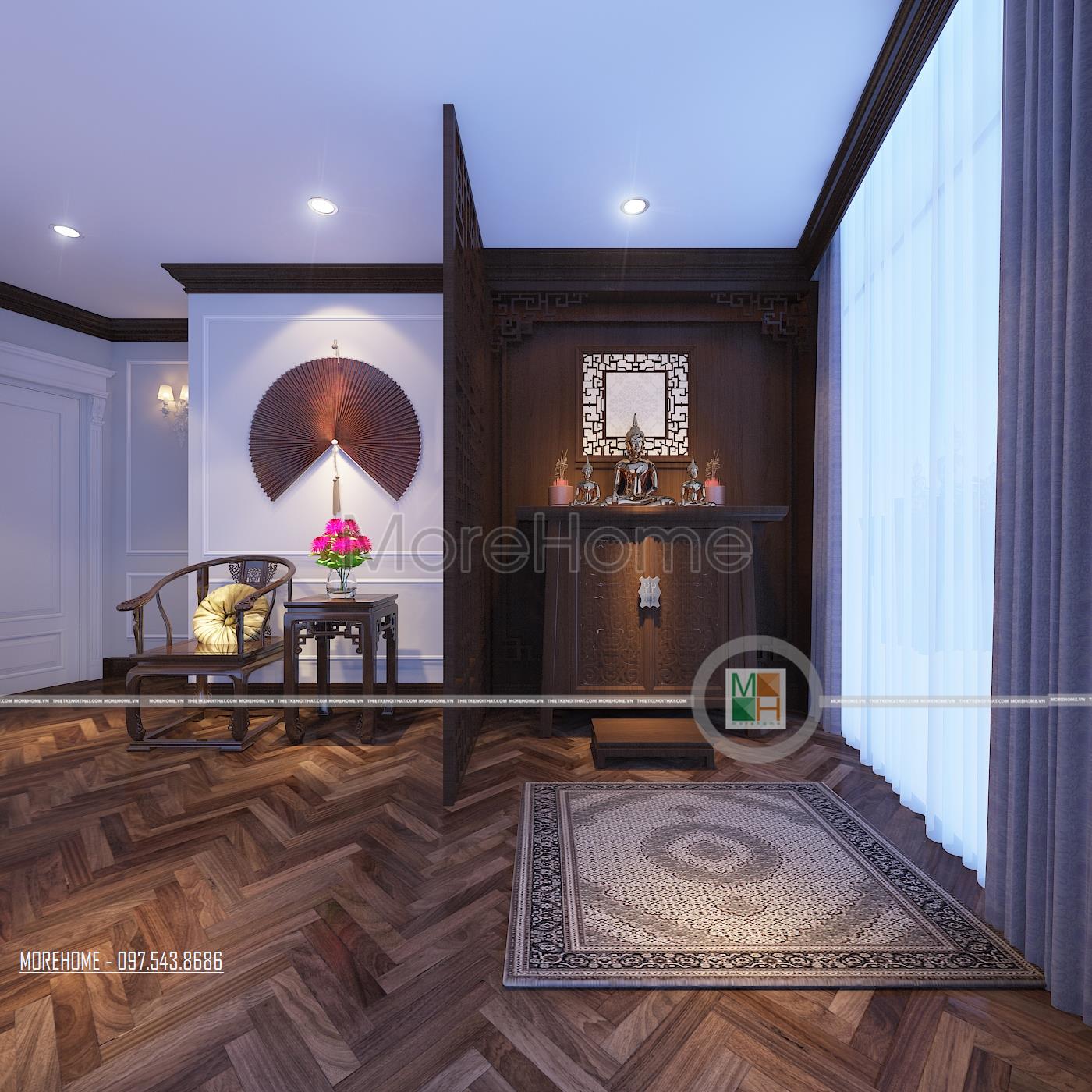Các căn chung cư có diện tích hẹp thường sử dụng khung bàn thờ dạng treo để tiết kiệm diện tích tuy nhiên với thiết kế như vậy, gia chủ dễ dàng gặp khó khăn khi muốn lau dọn hay sắp xếp đồ đạc. Chính vì vậy, với thiết kế căn hộ cao cấp Keangnam, diện tích khá rộng, thiết kế khu tâm linh được ưu ái dành trọn một khu nhỏ trong diện tích sinh hoạt chung. Thiết kế vách gỗ ngăn cách không gian vừa đảm bảo tính thẩm mỹ lại không làm mất đi sự linh thiêng vốn có của không gian này.