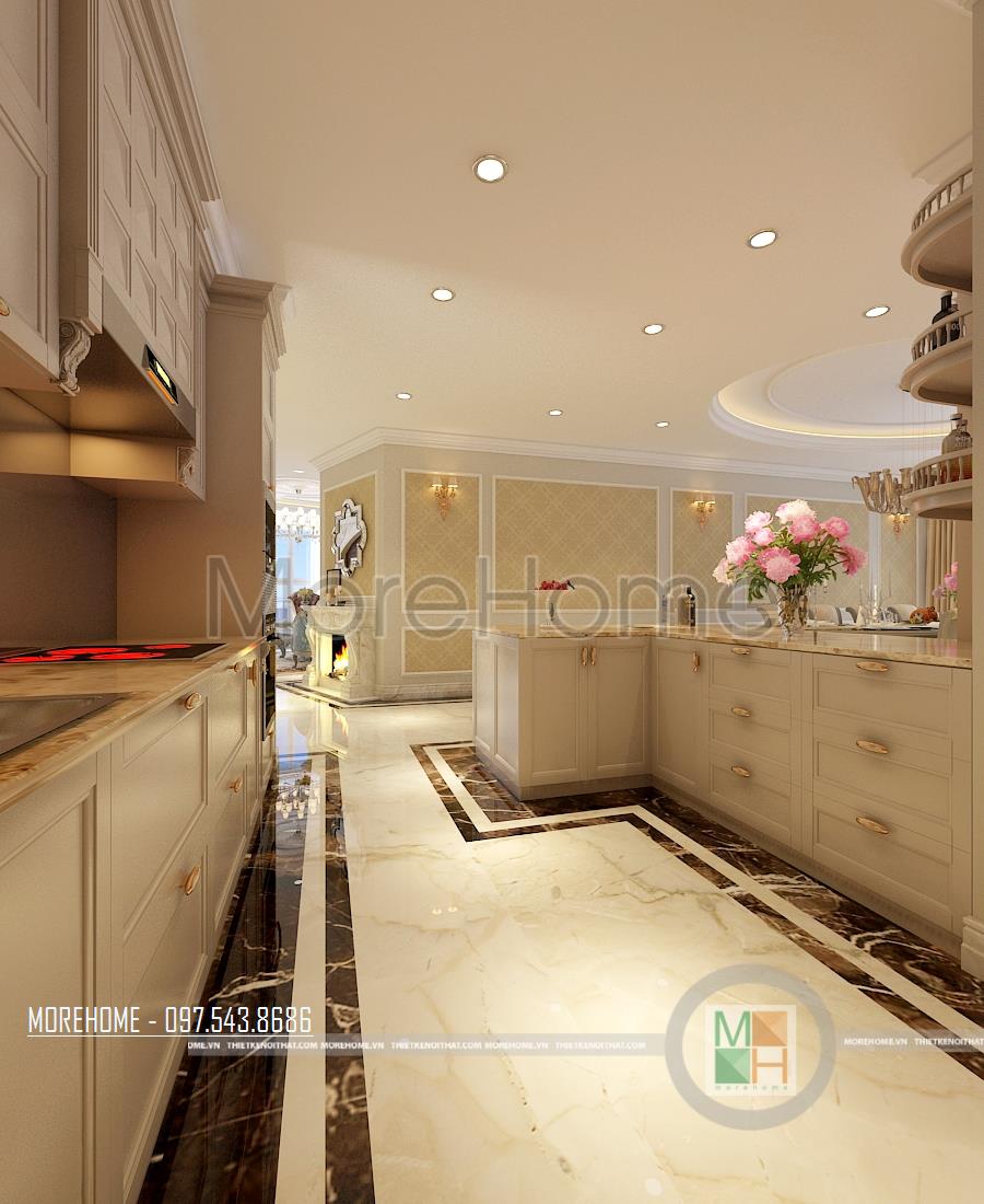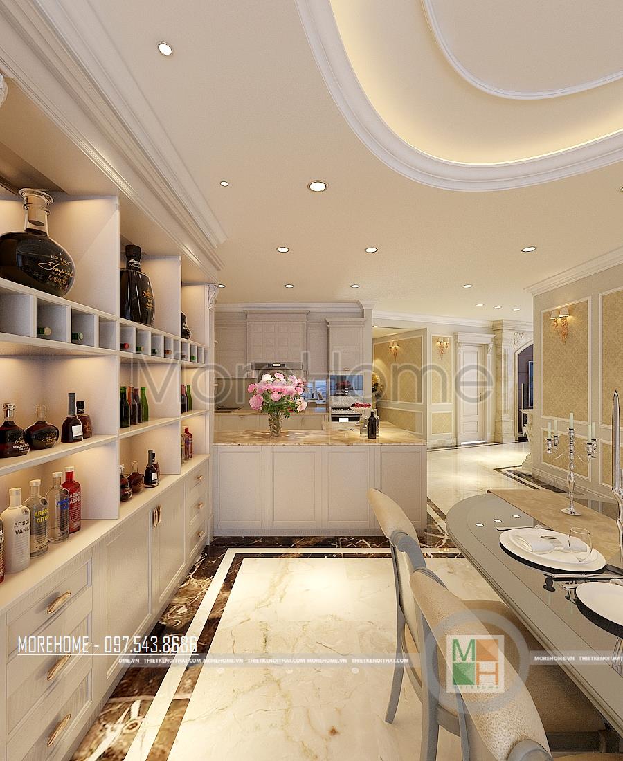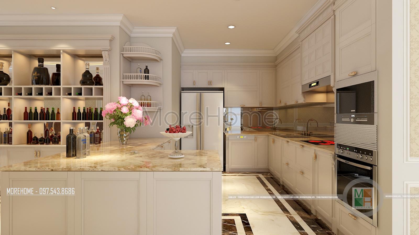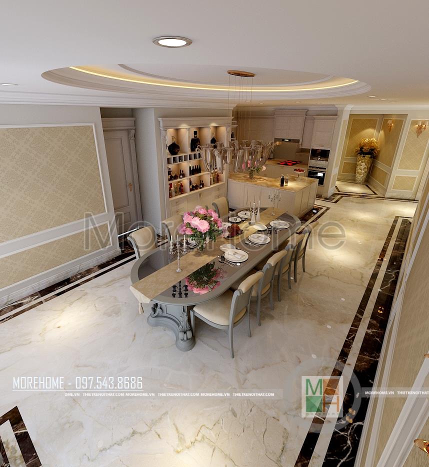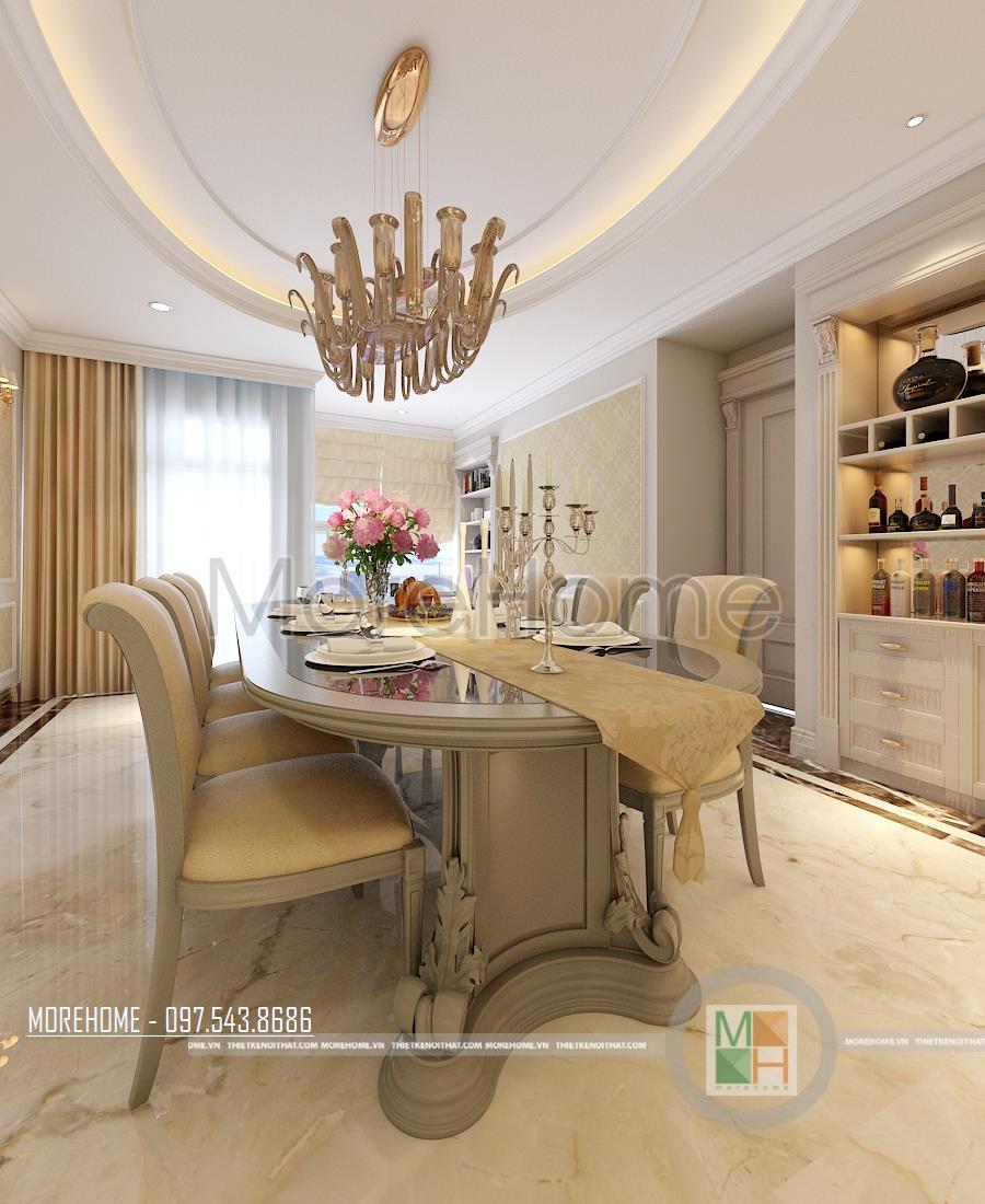 Thiết kế nội thất bàn ăn và phòng bếp liền kề với tone màu kem và ghi sáng khá đặc biệt tạo cảm giác tinh tế và nhẹ nhàng trong thiết kế. Bên cạnh đó, các chi tiết trang trí cầu kỳ hay trạm khắc tinh xảo cũng là điểm nhấn giúp mang đến sự đồng bộ cho không gian thiết kế, tạo sự nhất quán và góp phần định hình phong cách thiết kế tân cổ điển cho căn nhà.