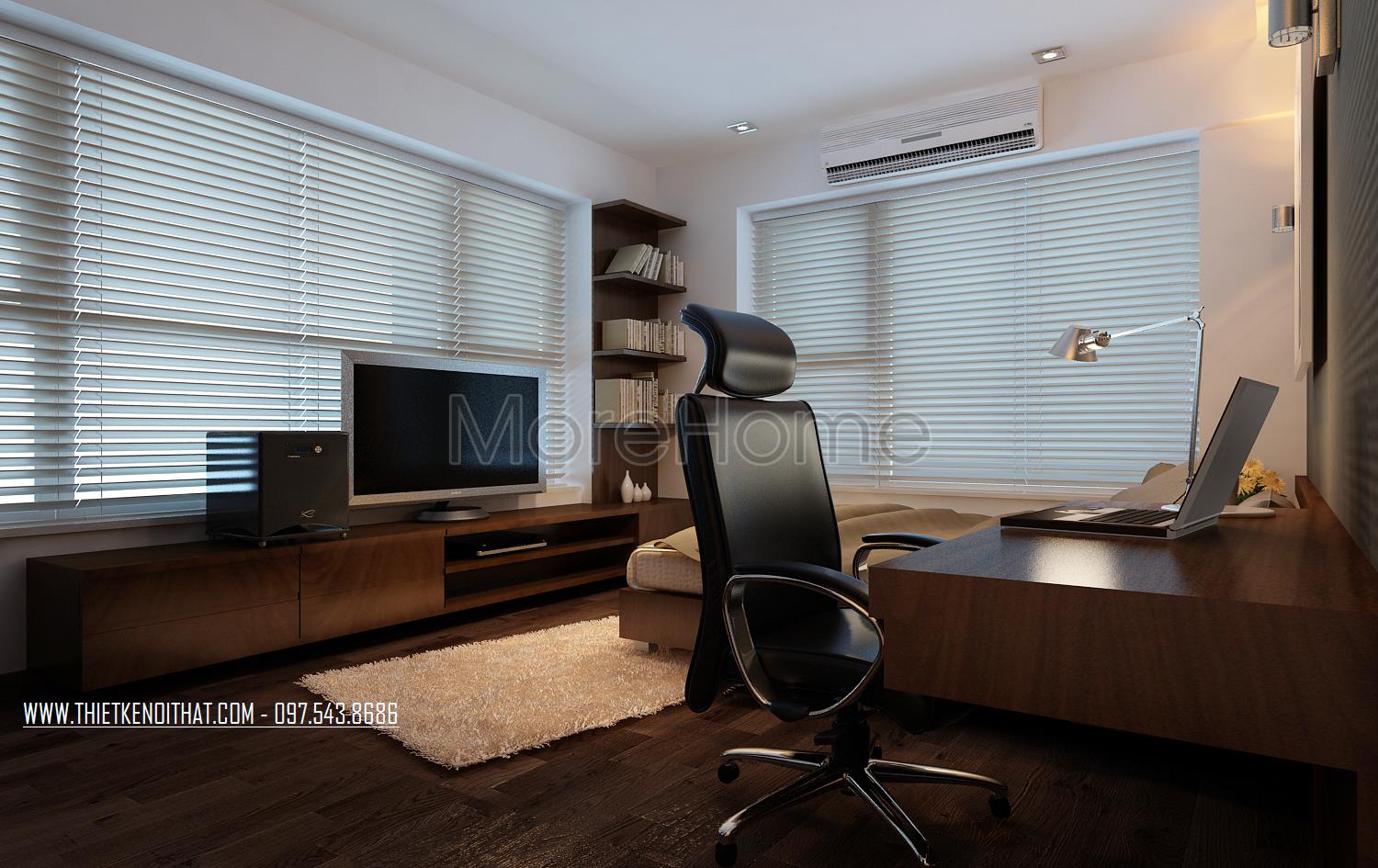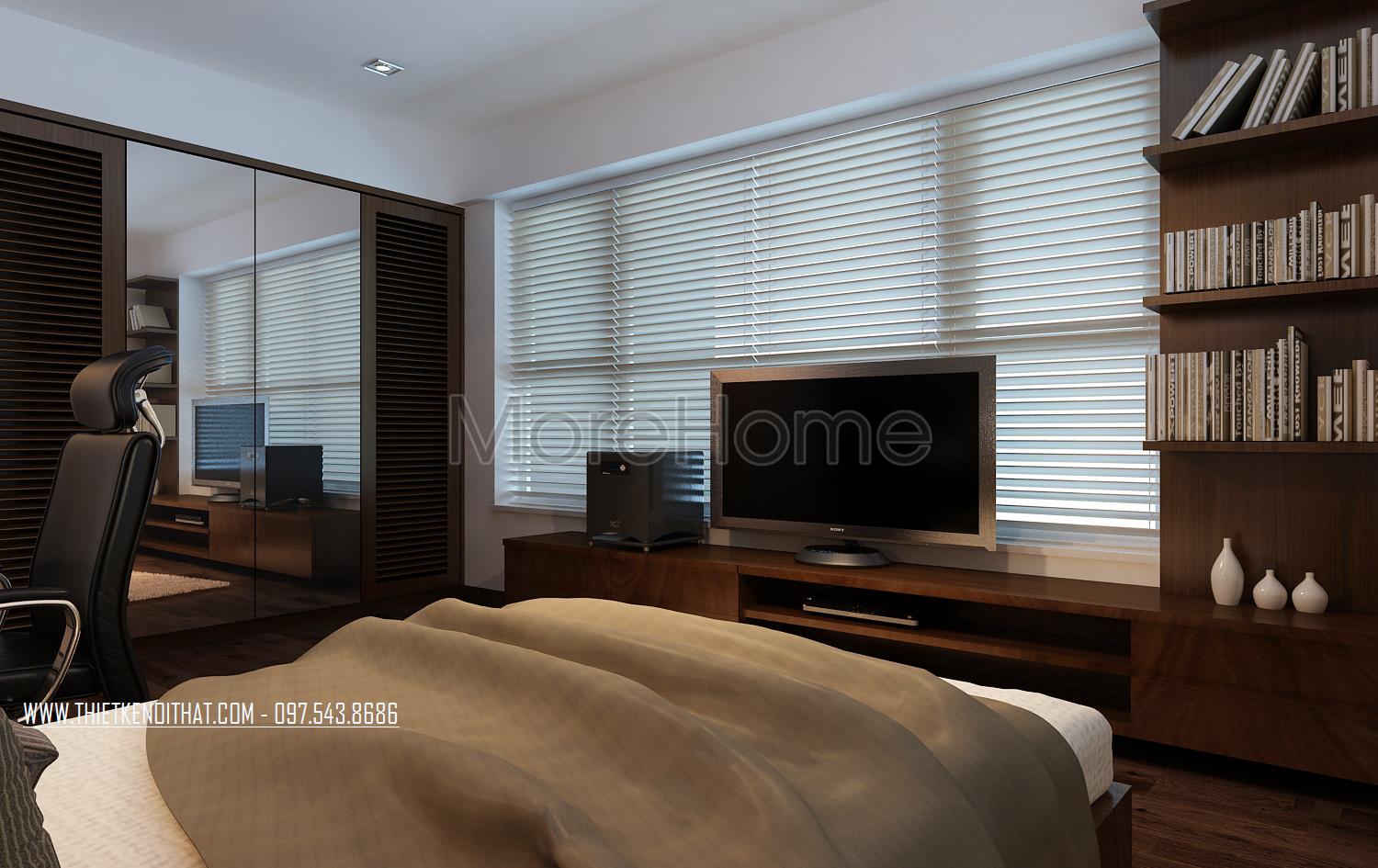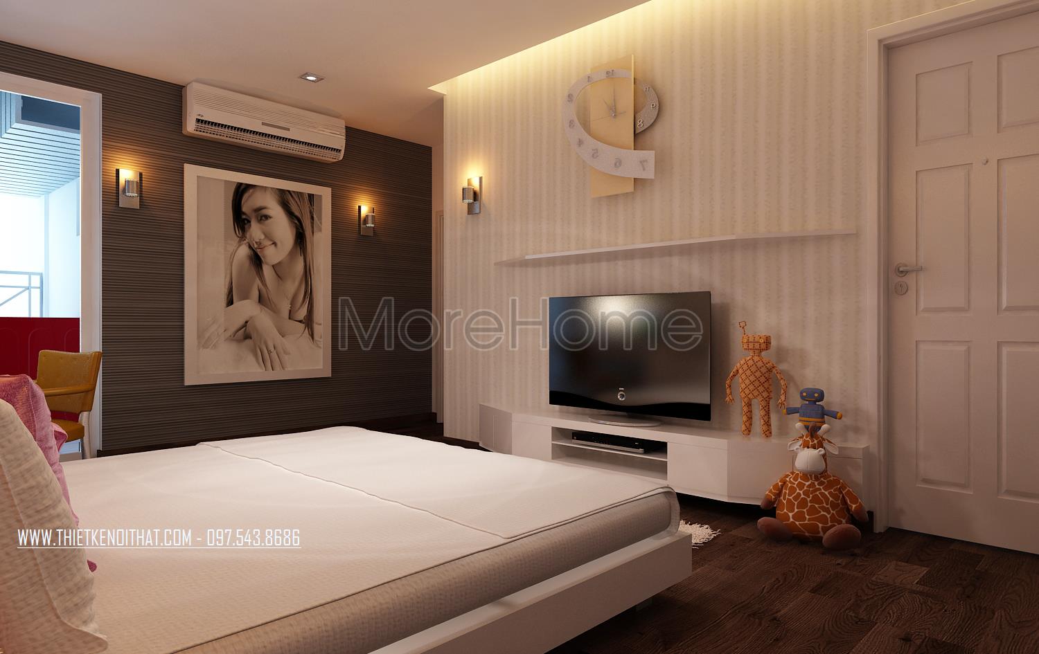 Thiết kế nội thất phòng ngủ hiện đại khá đơn giản. Điểm nhấn của không gian này chính là thiết kế hai cửa sổ mở rộng giúp đem đến sự cân bằng trong không gian sống nội và ngoại thất. Chính vì thiết kế này mà ánh sáng tự nhiên được tận dụng một cách triệt để mang đến cho gia chủ sự hứng khởi, tránh cái bí bách và gò bó của thiết kế bốn bức tường đơn điệu.