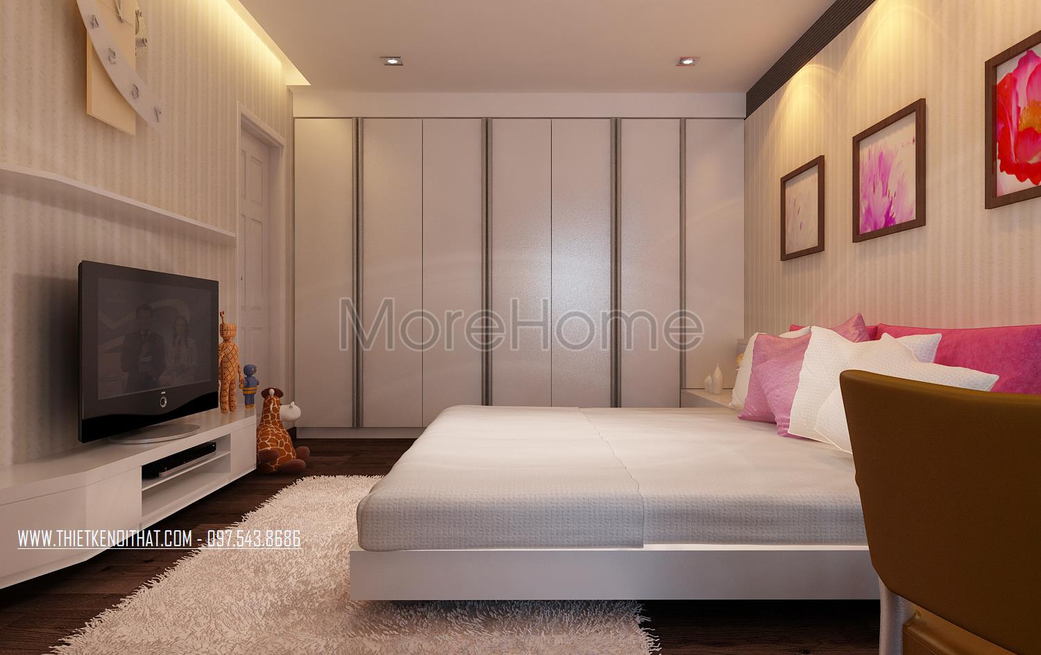 Thiết kế nội thất phòng ngủ tiếp theo sử dụng tone màu hồng phấn nhẹ mang đến sự nhẹ nhàng và nữ tính hơn hẳn. Các thiết kế tủ kệ thanh ngang vẫn được kiến trúc sư lựa chọn giúp tạo điểm nhấn công năng, linh hoạt khi thu dọn, và hơn cả đó là tạo độ thoáng cho không gian.