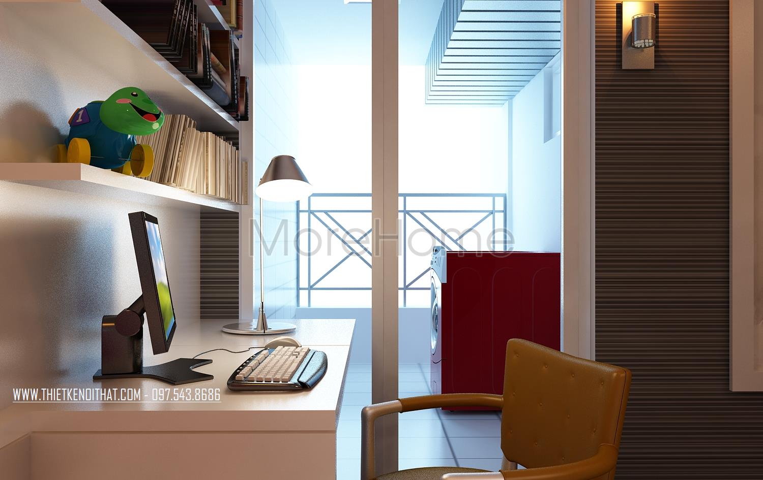 Thiết kế tủ âm tường cũng được kiến trúc sư sử dụng giúp mang đến sựu cơi nới cho căn phòng. Việc lựa chọn tone màu trắng sáng đồng nhất với màu sơn tường đơn sắc cũng chính là dụng ý của kiến trúc sư khi muốn mang đến sự thống nhất trong thiết kế.