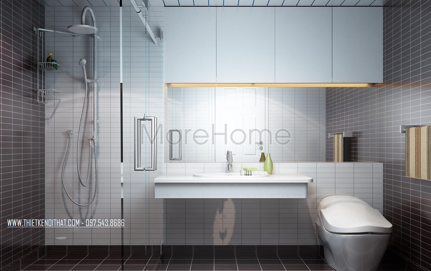 Cuối cùng là thiết kế nội thất nhà vệ sinh hiện đại. Các vật liệu nhẹ như kính cường lực và gương được kiến trúc sư lựa chọn và sử dụng khá nhiều. Đặc điểm phản chiếu và trong suốt của hai vật liệu này cũng chính là yếu tố căn bản tạo độ thoáng và giúp không gian nhà vệ sinh trở nên mở hơn rất nhiều. Các thiết kế khác được sử dụng hai tone màu căn bản là trắng và đen mang đến sự hiện đại thống nhất xuyên suốt cả căn hộ.