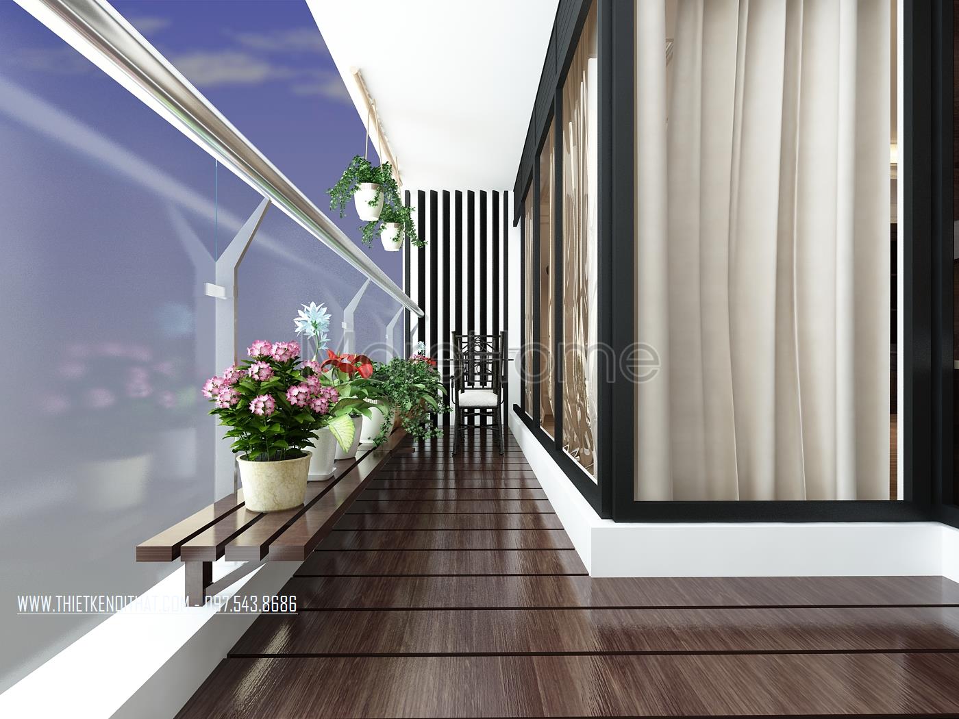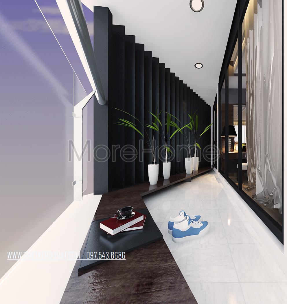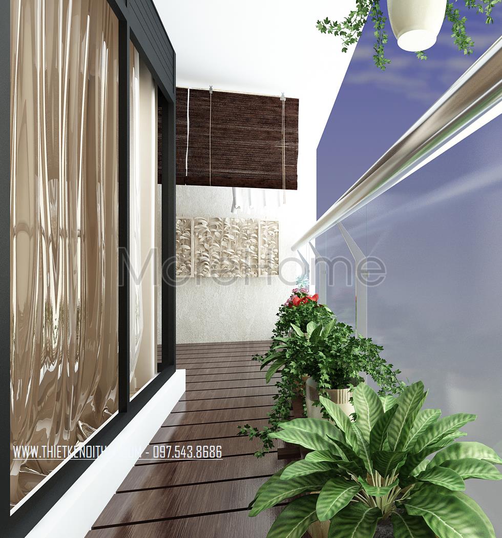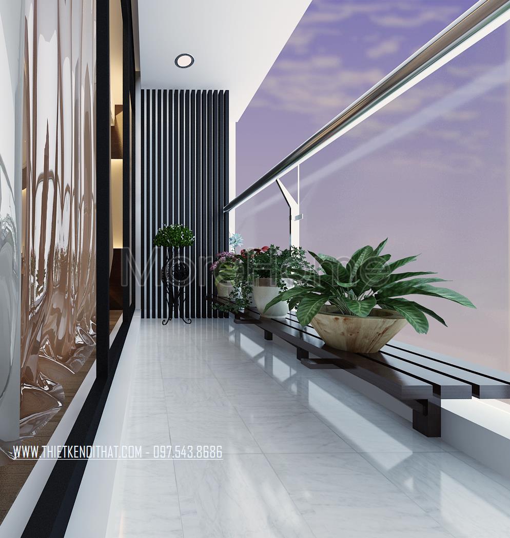 Phần không gian hành lang mới thực sự là điểm ấn tượng khi kiến trúc sư đã tận dụng chi tiết này làm nổi bật lên sự thư giãn, đem lại cảm giác một mái ấm thực thụ. Tại đây đặt những chậu hoa xinh xắn để mỗi khi gia chủ mệt mỏi hay muốn tận hưởng khung cảnh bên ngoài đều cảm thấy thích thú và vui vẻ. Ở đây cũng sử dụng sàn gỗ để tạo sự đồng nhất với tổng thể căn nhà nhưng mang màu nâu đất để hài hòa với thiên nhiên với những chậu cây gần đó.