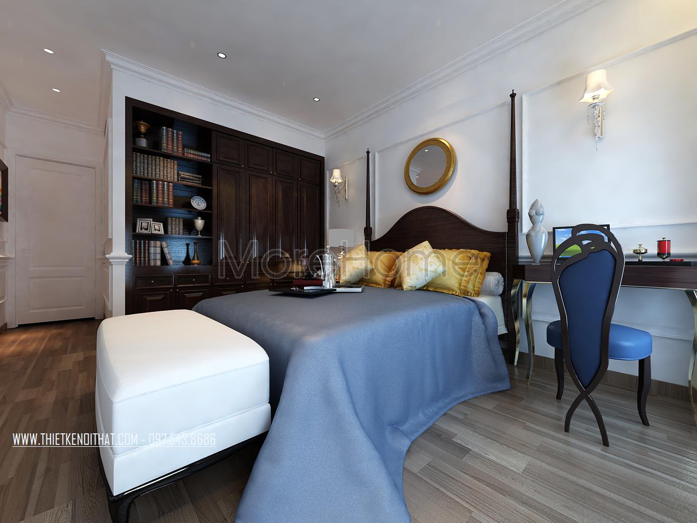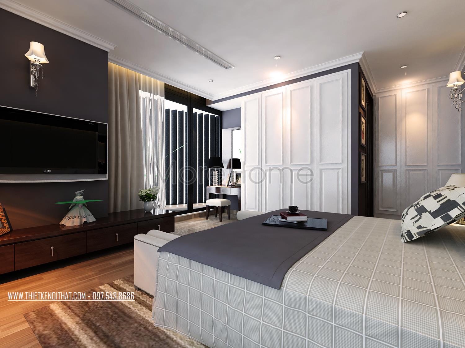 Phòng ngủ của gia chủ rất thú vị với chi tiết tủ âm tường trắc là đặc trưng của phong cách thiết kế tân cổ điển. Giường ngủ sử dụng tone màu trắng xám chi tiết kẻ caro đồng diệu với sàn gỗ và thảm trả sản. Màu đen của khung tường đằng sau cũng vô tình mà hữu ý giúp căn phòng trở nên sang trọng hơn. Phần bàn trang điểm liền kề ban công nhìn ra không gian bên ngoài thật tinh tế. Gian phòng ngủ chính này với 2 bên ban công đều nhìn ra không gian bên ngoài giúp căn phòng vô hình chung như đang ở giữa trời mây.