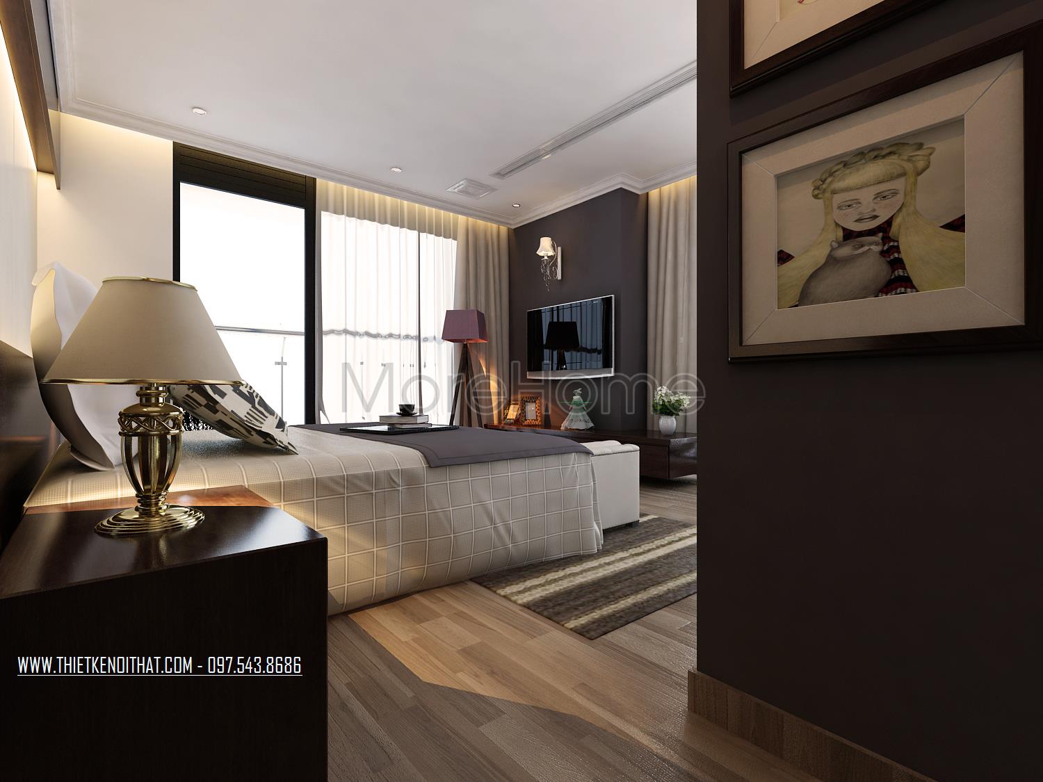 Đầu tiên, đến với gian phòng đọc sách. Phòng đọc sách được đặt liền kề phòng khách và nối với ban công. Đây là nơi gia chủ làm việc cũng như trao đổi công việc hay gia tăng kiến thức. Do vậy thiết kế nhấn vào những sự đơn giản, thoáng rộng chứ không đi sâu vào chi tiết. Tủ đọc sách cũng đặt âm tường song sơn màu gỗ nâu đất giúp nhấn vào tủ. Các bức tranh cũng được sử dụng như vừa để tạo sự thư giãn cho gia chủ vừa giúp căn phòng trở nên thông thái hơn. Màu sắc bức tranh là đen trắng rất hài hóa với màu sắc chủ đạo của căn phòng.