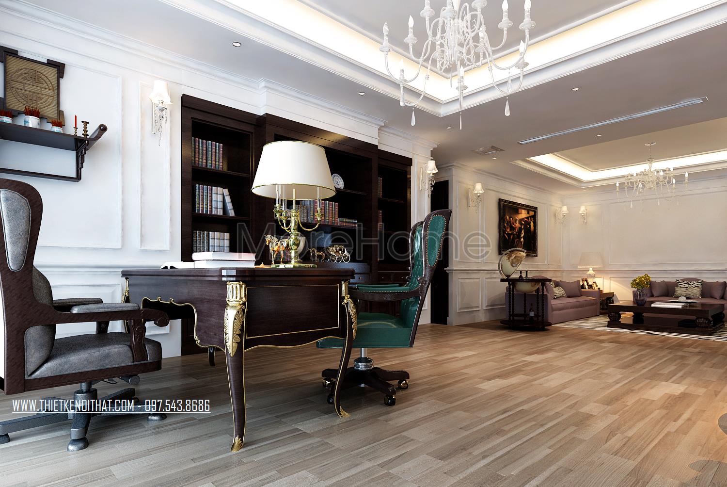 Thiết kế nội thất phòng khách liền kề phòng đọc sách với bộ ghế sofa mang màu huyết dụ sang trọng quý phái. Bức tranh treo tường họa cổ điển cũng giúp căn phòng càng mang dấu ấn cổ điển hơn bao giờ hết. Bộ đèn chùm cũng kết hợp hết sức hài hòa với những chi tiết đèn khác trong căn phòng giúp căn phòng càng trở nên sang trọng hơn với phong cách thiết kế nội thất tân cổ điển. Chi tiết thảm trải sàn hình lượn sóng ngựa vằn cũng là chi tiết đáng chú ý giúp căn phòng không bị nặng nề mà thành lịch hài hòa. Rất ăn nhập giữa màu tường TV với màu tường và trần nhà trắng.