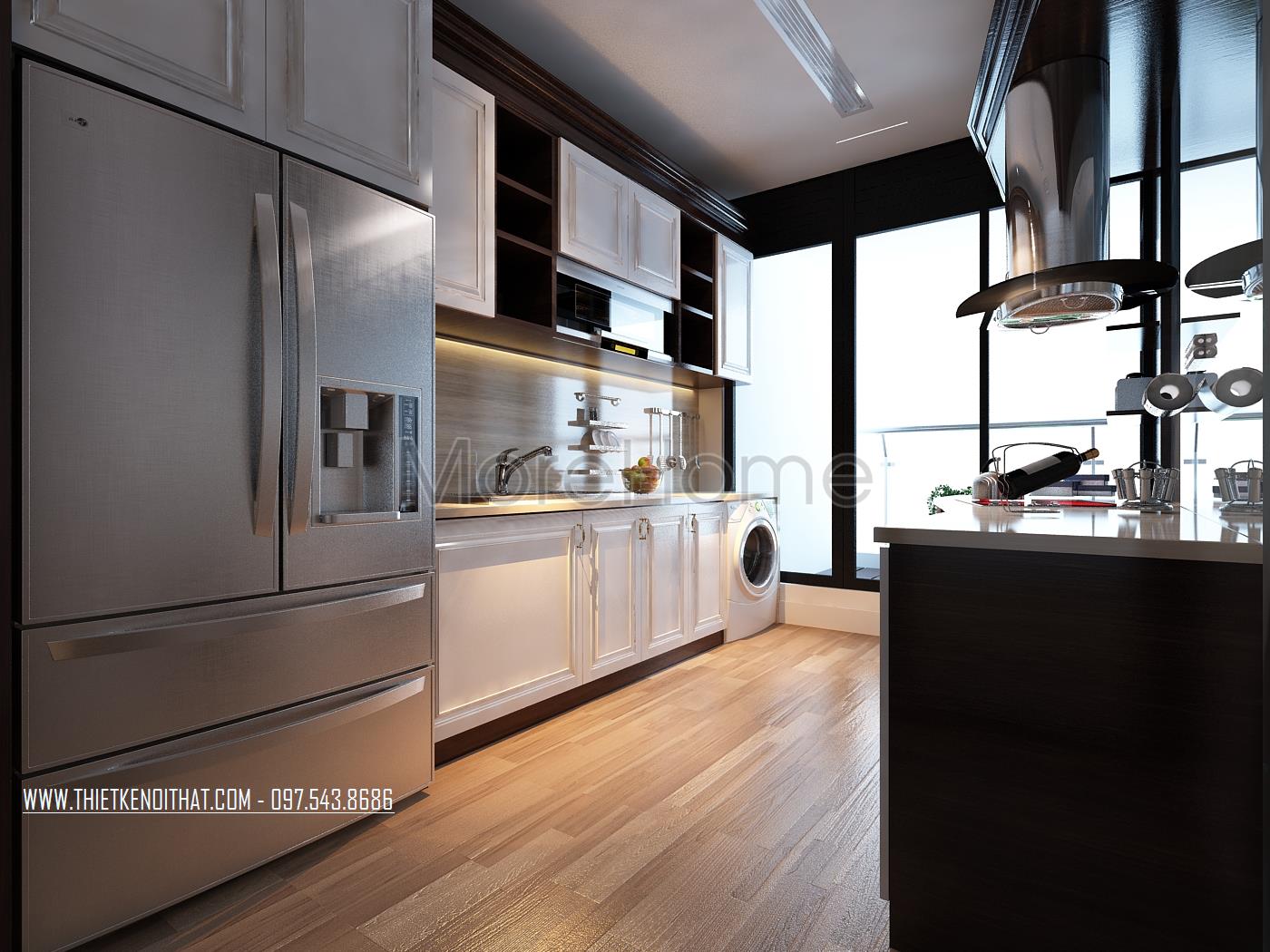 Phòng bếp nằm trong gian phòng nhỏ cạnh khu bàn ăn thực sự là một điểm nhấn rất thú vị khi nó gợi không gian mở với cửa sổ ra hành lang. Như vậy, mỗi khi chủ căn hộ nấu những món ăn ngon cho gia đình đều sẽ được thoải mái với phong cảnh bên ngoài thư thái. Đặc biệt, phòng bếp là nơi hộ tụ điểm hiển đại trong phong cách tân cổ điển vì như vậy sẽ giúp căn bếp sáng và gọn nhẹ mà không bị bí bách ở các chi tiết tủ bếp, máy hút khói, lò nướng âm.