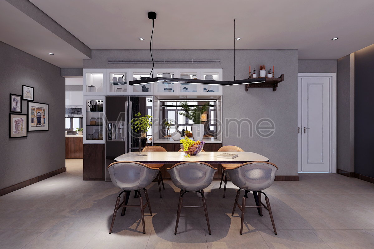 Thiết kế nội thất bàn ăn và phòng bếp liền kề với tone màu kem và ghi sáng khá đặc biệt tạo cảm giác tinh tế và nhẹ nhàng trong thiết kế. Bên cạnh đó, các chi tiết trang trí cầu kỳ hay trạm khắc tinh xảo cũng là điểm nhấn giúp mang đến sự đồng bộ cho không gian thiết kế, tạo sự nhất quán và góp phần định hình phong cách thiết kế nội thất căn hộ happy valley phong cách hiện đại.
