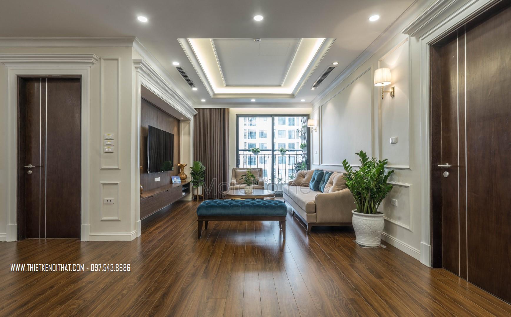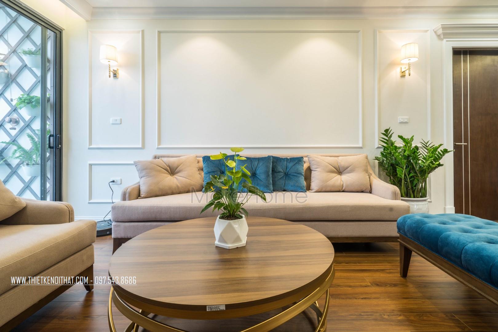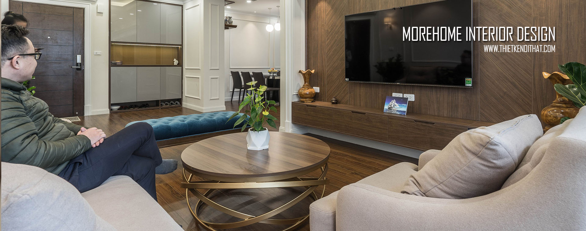 Đến với không gian phòng khách sẽ chứng minh được điều đó qua vẻ đẹp tự nhiên, chân thật của mẫu đồ nội thất do Morehome thiết kế và thi công nội thất. bộ sofa vải với tone màu be và xanh dương tạo nên sự mát mẻ tươi mới cho căn phòng. Đây là mẫu sofa được xưởng sản xuất Moresofa của Morehome sản xuất dựa trên bản thiết kế 3D. Chiếc bàn trà hình tròn được làm kết hợp từ mặt bàn gỗ tự nhiên và khung chân sắt họa tiết sáng tạo. Mảng tường đối diện với bộ sofa được thi công với vách ốp gỗ veneer màu nâu socola cao cấp tạo nên sự thân thiện và ấm áp cho căn phòng. Những chậu cây cảnh phong thủy được đặt trong không gian phòng khách như kim tiền tạo sự sang trọng cho phòng khách của căn hộ này.