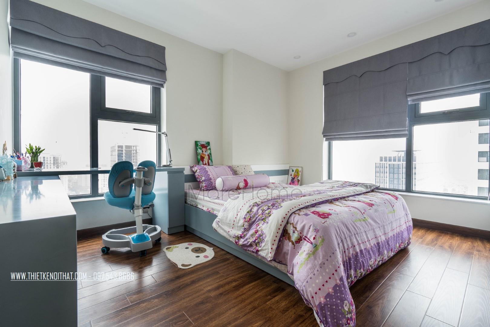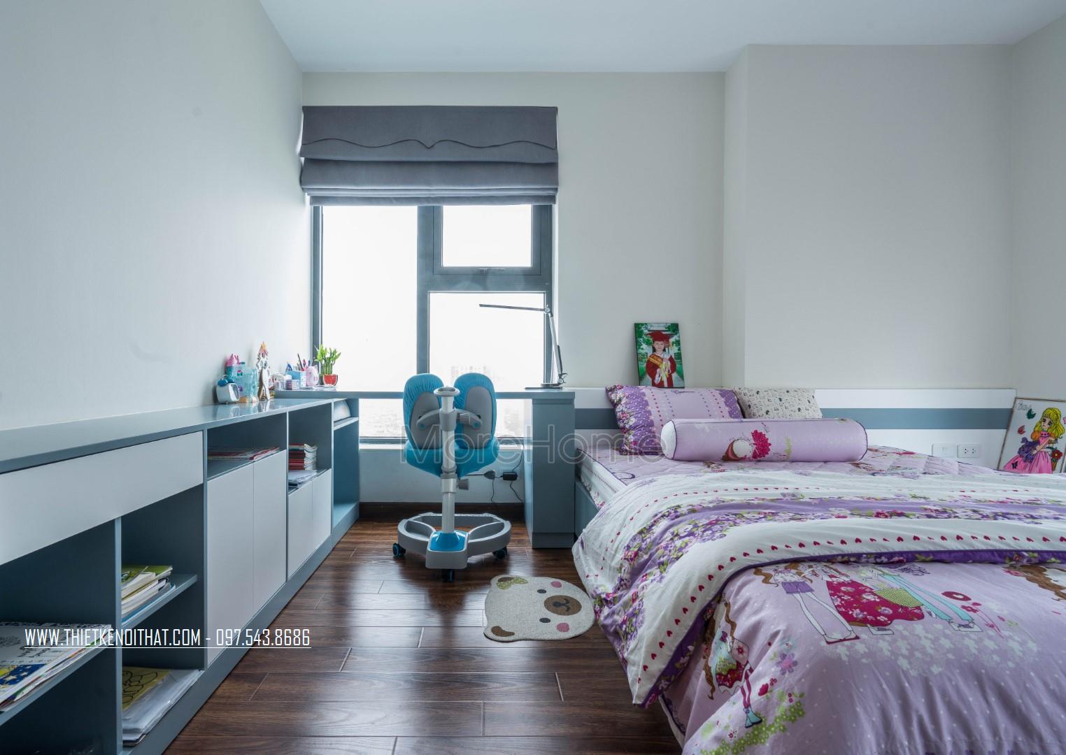 Phòng ngủ bé gái được thi công với những mẫu đồ nội thất cute, đáng yêu. Chiếc tủ đựng sách vở màu xanh trắng, nhẹ nhàng và hiện đại, chiếc ga giường họa tiết hoạt hình được trải trên chiếc giường màu xanh tạo nên không gian phòng ngủ mơ mộng và tươi mới cho bé.