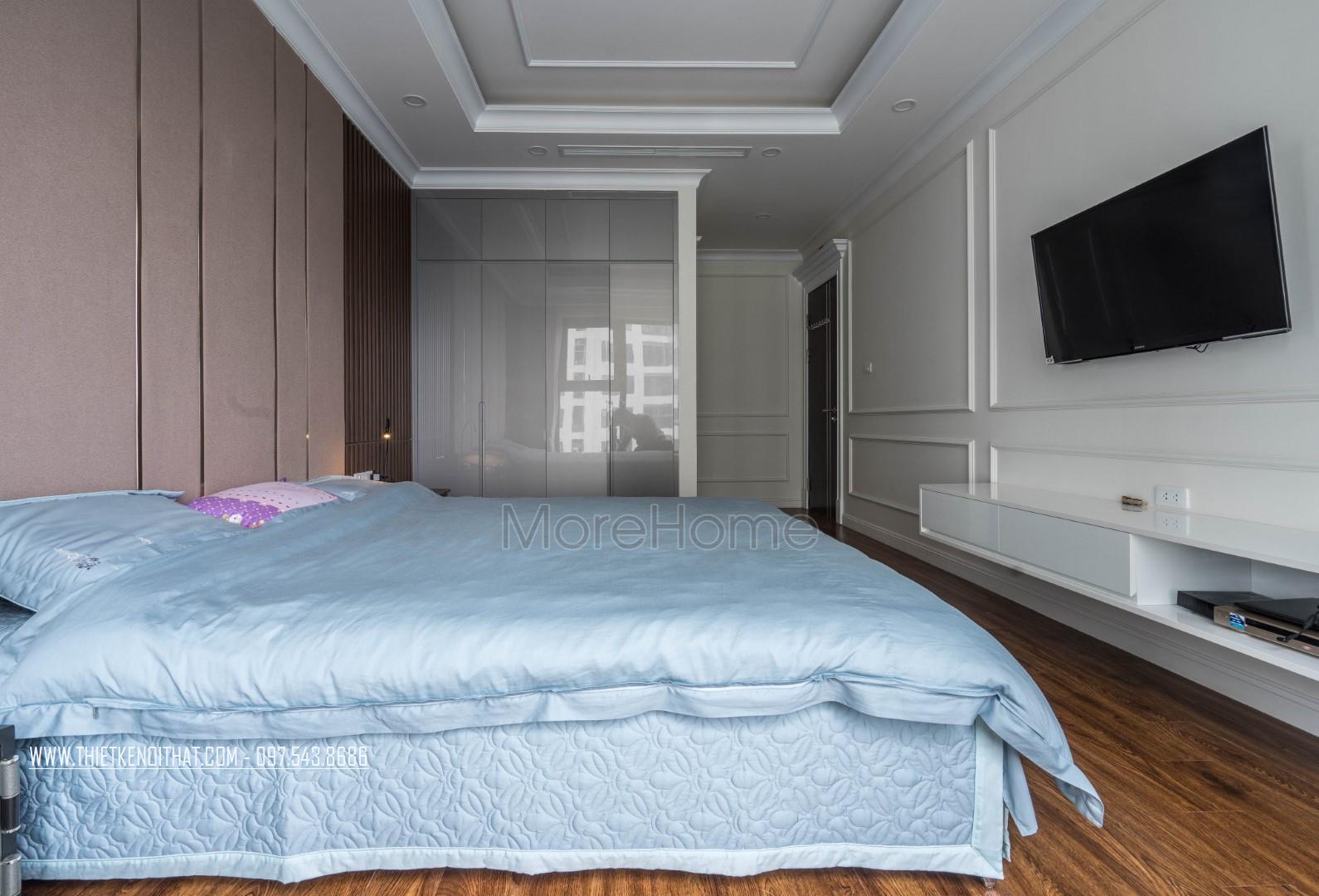 Thiết kế và thi công nội thất phòng ngủ bố mẹ hiện đại, sang chảnh với gam màu trắng và màu xanh nhạt của bộ ga giường. Phòng ngủ được thiết kế khá đơn giản, phần đầu giường được ốp bọc sofa màu sữa đục, tủ áo được thiết kế âm tường với chất liệu gỗ acrylic bóng gương tạo nên sự tinh tế nhất định cho căn phòng. Tab đầu giường và kệ tivi được thiết kế tối giản để không làm cho không gian phòng ngủ bị chật chội, ngược lại KTS đã thiết kế một không gian phòng ngủ thông thoáng và thoải mái cho bố mẹ.