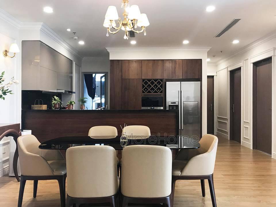 Liền kề với không gian tiếp khách là không gian ăn uống, được thi công nội thất gỗ tự nhiên cao cấp. Thiết kế nội thất chung cư với bộ bàn ăn 6 người chất liệu gỗ sồi kết hợp bọc da cao cấp được thi công giống như bản thiết kế giúp cho không gian ăn uống hoàn hảo, ấm áp và thân thiện hơn.