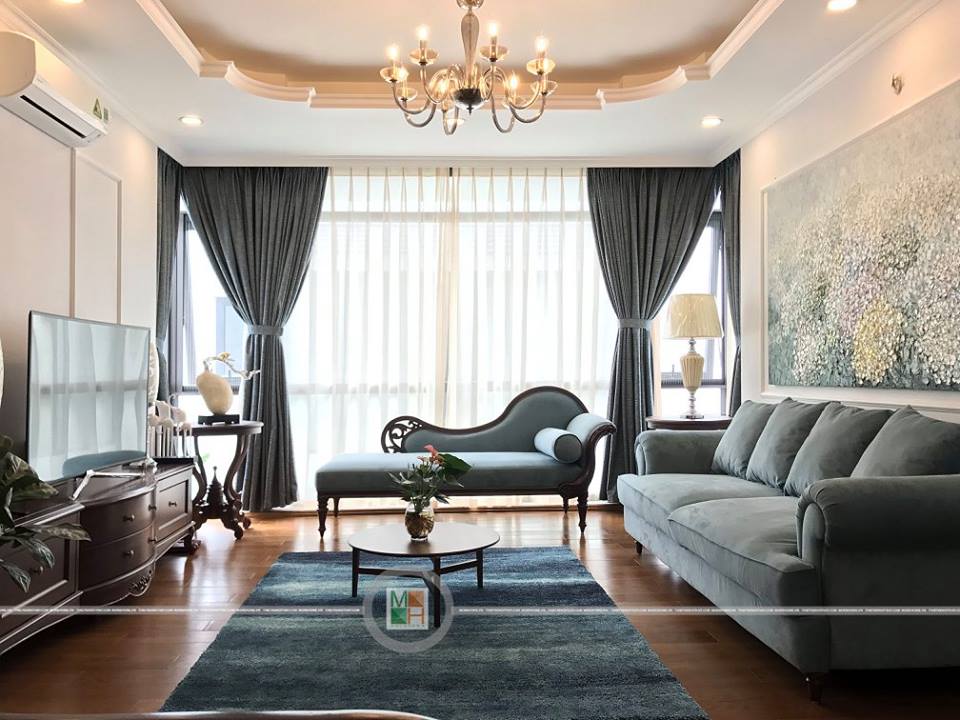 Thiết kế ghế sofa được gia chủ lựa chọn có tone màu xanh navi ấn tượng giúp mang lại sự cân bằng về màu sắc cho không gian. Các đường cong hay trạm khắc tinh xảo nơi ghế tựa, bàn nước, hay ghế dài, hay chất liệu nhung mềm mại là những yếu tố góp phần lớn định hình nét tân cổ điển cho thiết kế.