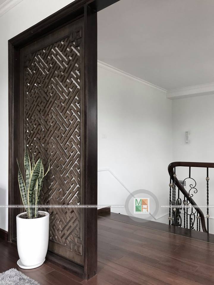 Một điểm dễ dàng nhận ra ở thiết kế này là kiến trúc sư đã thay thế sử dụng các bức tường thô cứng bí bách bằng thiết kế vách ngăn gỗ óc chó với hoa văn tinh xảo, thu hút. Bằng việc thay thế này, kiến trúc sư vẫn giữ được sự rõ ràng, tách biệt trong các không gian thiết kế khác nhau, lại giúp tăng độ thoáng và mở cho không gian sinh hoạt chung.