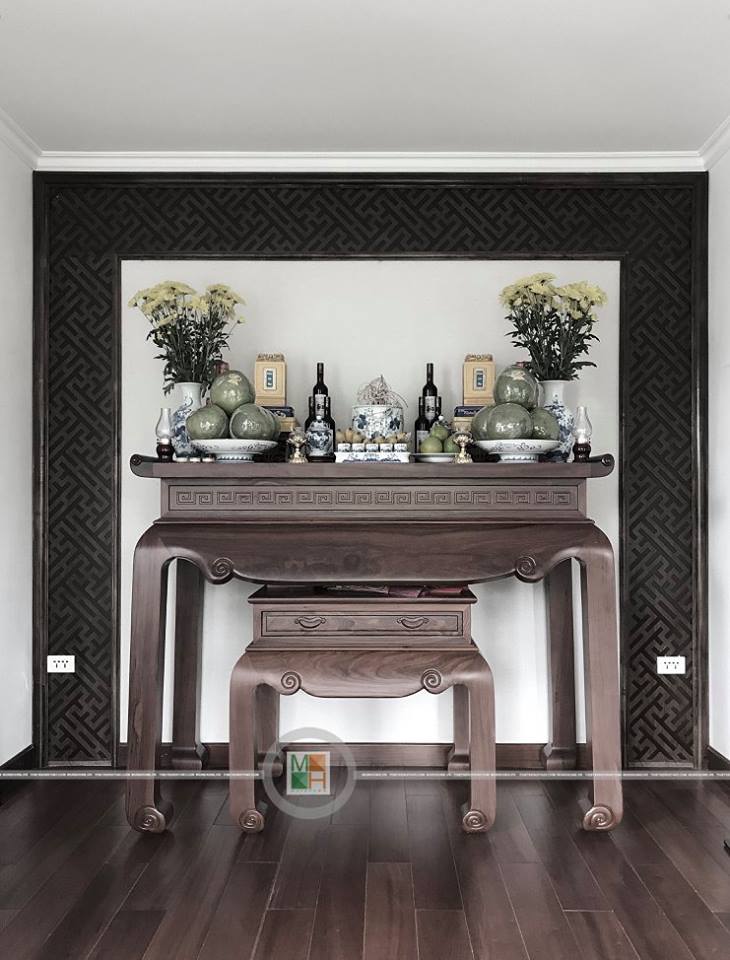 Trong quá trình thi công nội thất khu vực thờ cúng tâm linh, kiến trúc sư vẫn luôn lưu ý đến vẻ đẹp tân cổ điển xuyên xuyết không gian. Các chi tiết trạm khắc tinh xảo và việc sử dụng tone màu nâu gỗ trầm ấm áp đã thể hiện rõ điều đó. Không gian bàn thờ được sắp đắt đối xứng tạo thế vững chãi và tăng tính thẩm mỹ cho thiết kế.