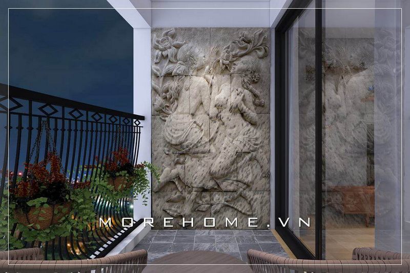 Một mẫu thiết kế ban công biệt thự đẹp, sử dụng song sắt cao cấp kết hợp chậu cây và bức tường đá điêu khắc độc đáo, đem lại một không gian thư giãn và tôn lên vẻ đẹp của căn nhà.